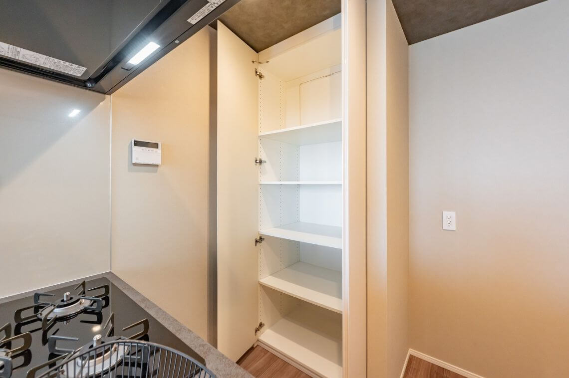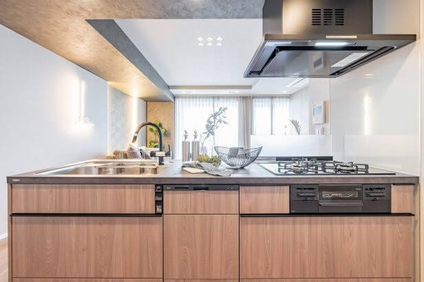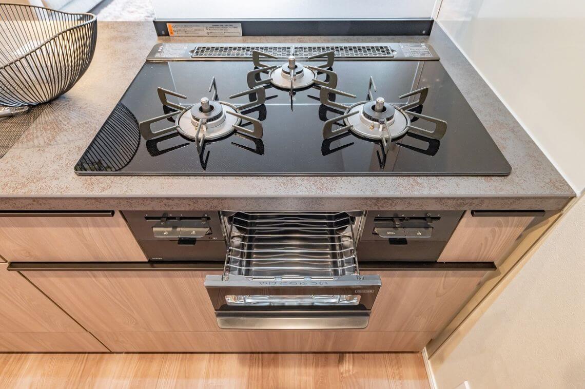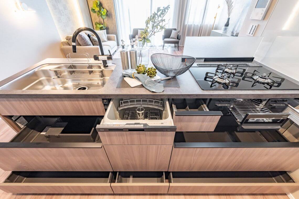 リビングダイニングが見渡せる開放的なオープンキッチン。家族やゲストと会話がしやすく、子どもの姿も見守れます。料理が捗る3口ガスコンロ、家事の時短に心強い食洗機付き。物の出し入れがしやすい引き出し式キャビネットで使い勝手の良さもポイントです。