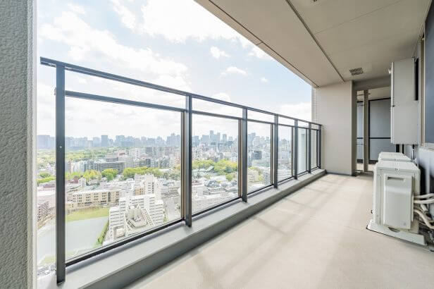 全居室に面したワイドスパンバルコニー。約17.66㎡のゆとりある空間で、手すり部分が透明になっており開放感もよりUP。29階部の高層階につき、眺望良好。皇居、北の丸公園、千鳥ヶ淵の緑が望めます。