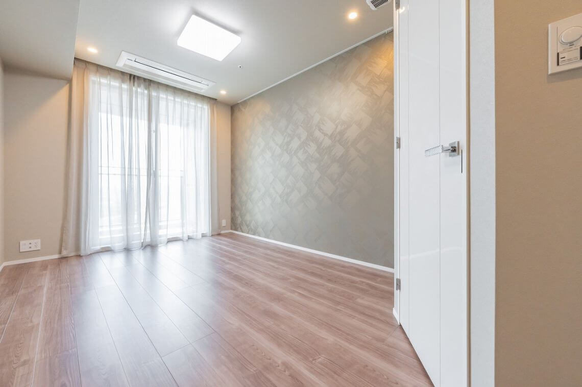 約8.0帖の洋室1。南東向きで陽当たり良好。バルコニーへの出入りも可能です。グレーのアクセントクロスで落ち着きのある雰囲気。WIC(ウォークインクローゼット)とビルトインエアコンも付いています。