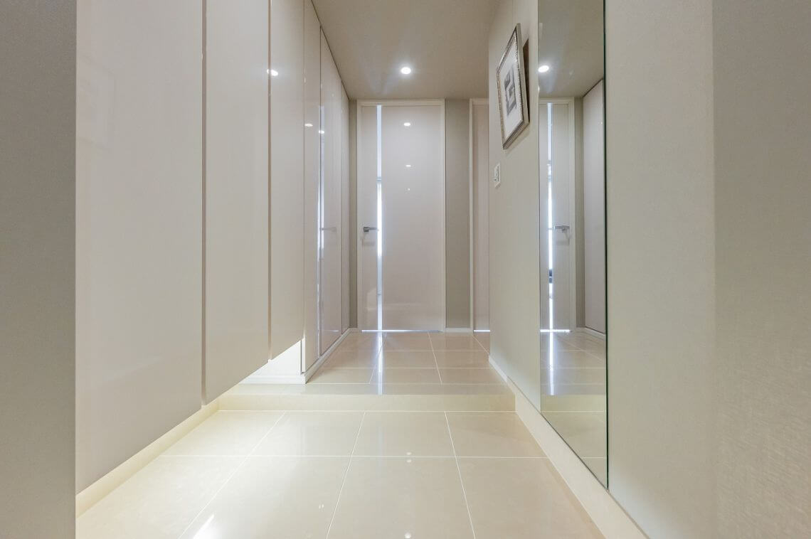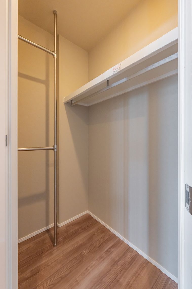 玄関ホールには大容量のシューズボックスを完備。靴がたっぷり収納でき、スポーツ用品やペット用品なども収納できそうです。姿見付きでお出かけ前の身だしなみチェックもできます。