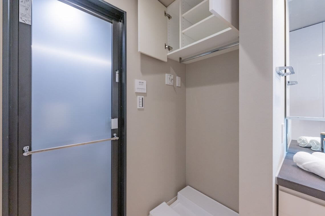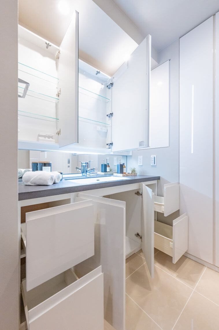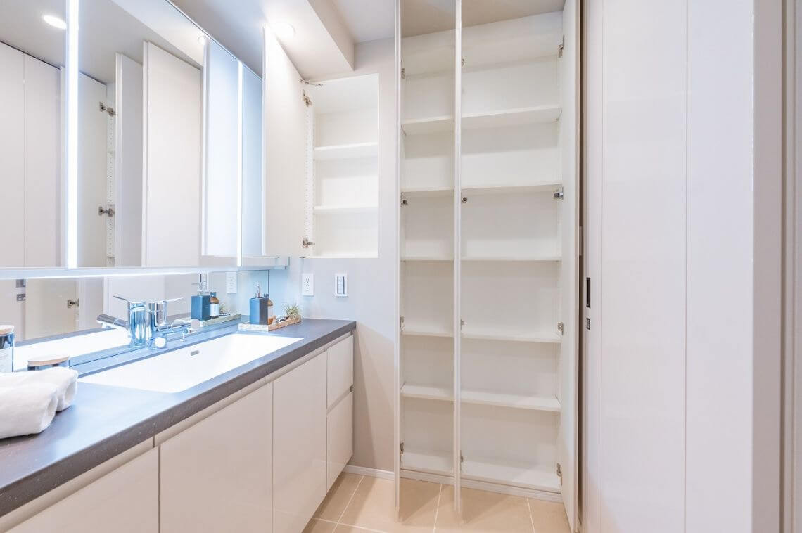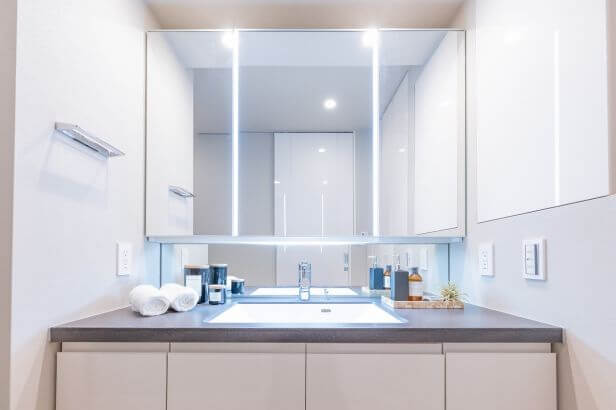 縦のライン照明が美しい洗面化粧台。洗面まわりの小物がすっきり整頓できるミラーボックス付きでいつでも整った状態をキープできそうです。洗面台とは別途、リネン庫も備わっています。