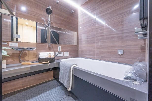 ウッド調であたたかみのある雰囲気のバスルーム。追い炊き機能の他、ミストサウナ・乾燥・暖房・換気の備わっており、一年中快適にバスタイムが楽しめます。