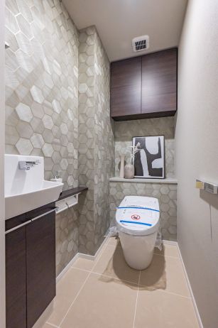 廊下に面したレストルーム。空間がすっきり見えるタンクレストイレです。独立型の手洗い器、収納スペース、2ロールのペーパーホルダーも付いています。ウォシュレットリモコンもスティック型でスタイリッシュです。