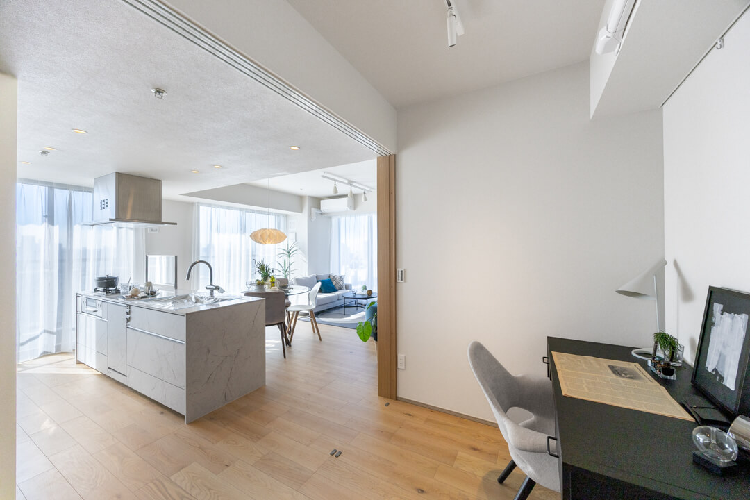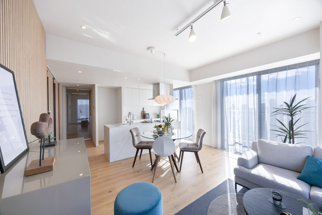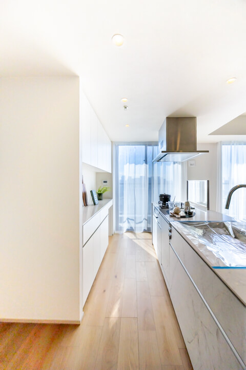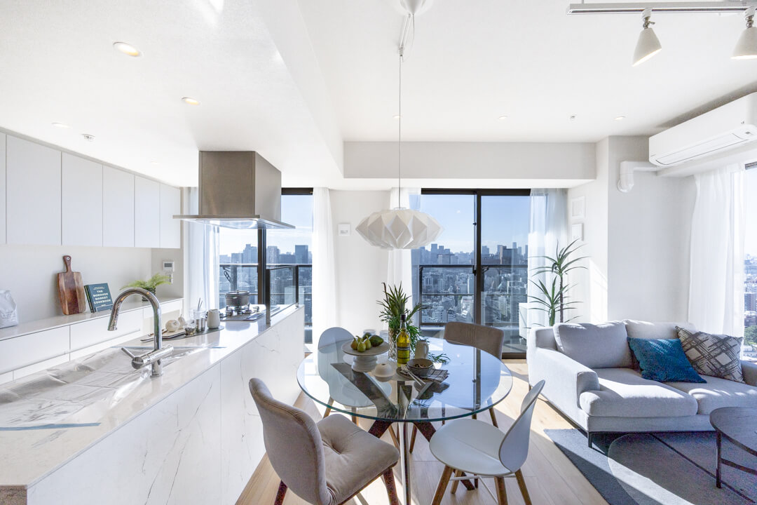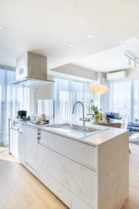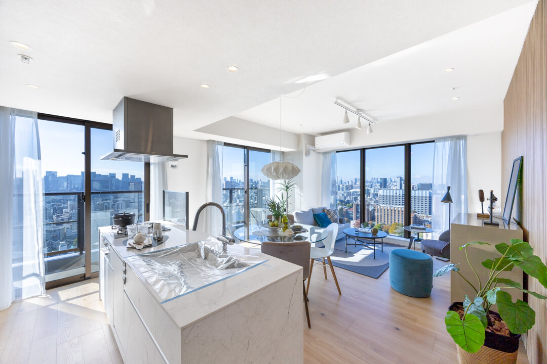約18.0帖の広々としたリビングダイニングキッチンです。南西角部屋のため窓に囲まれており、日当たり・通風が良好。開放感溢れる眺望が広がっています。