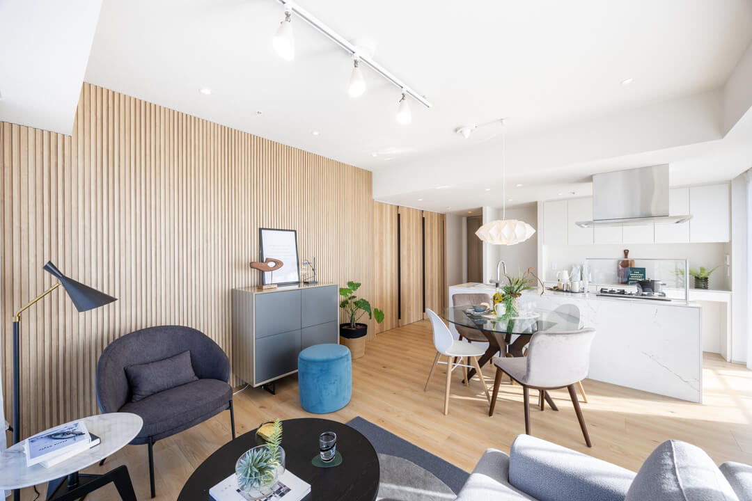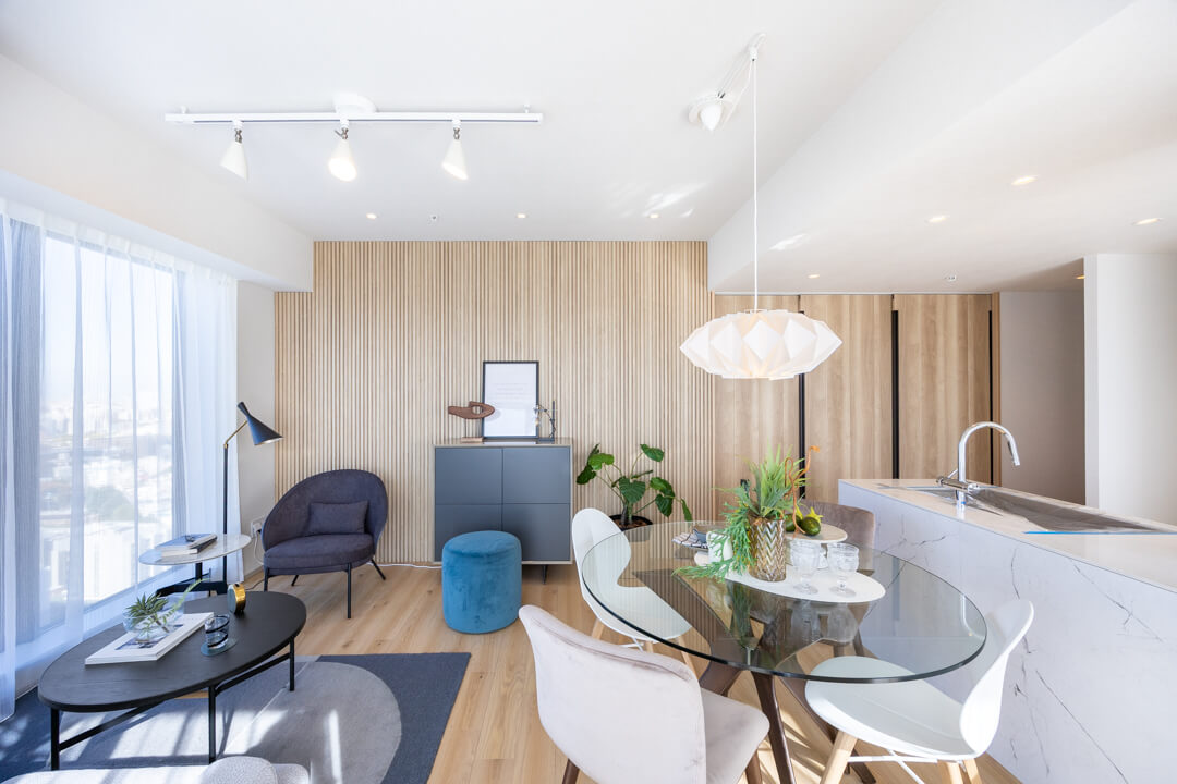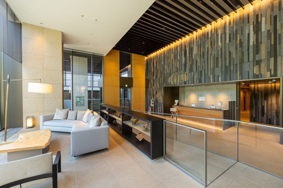 壁面にはリブパネルがあしらわれています。凹凸が光と影のコントラストをつくりだし、上質な雰囲気を演出してくれていますよ。