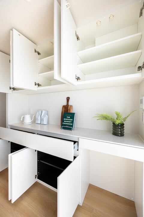 キッチンの背面側にはカップボードが備え付けられています。調味料や食器などを収納できるだけでなく、電子レンジなどを置くこともできるので便利です。