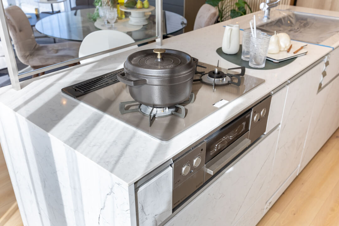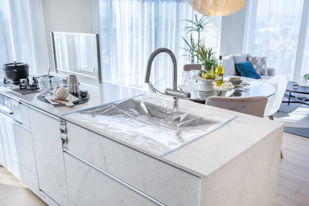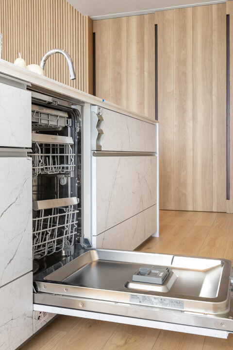 3口コンロ、グリル、大型食洗機付きと設備面も充実しています。シンクも広々としているので野菜などが洗いやすそうですよ。