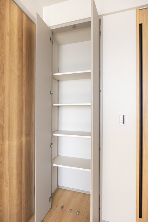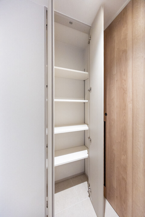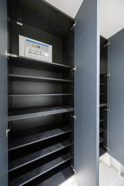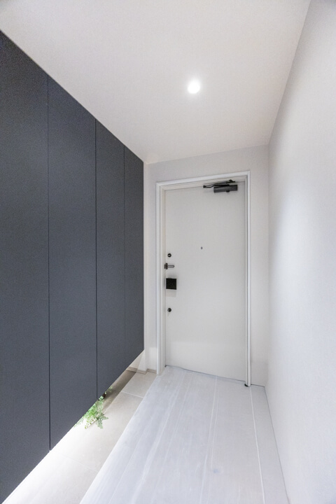スタイリッシュな雰囲気の玄関にはシューズボックスが備え付けられています。高さがありますが、フロートタイプのため空間に圧迫感を与えません。フットライト光が優しく足元を照らしてくれるのも◎。