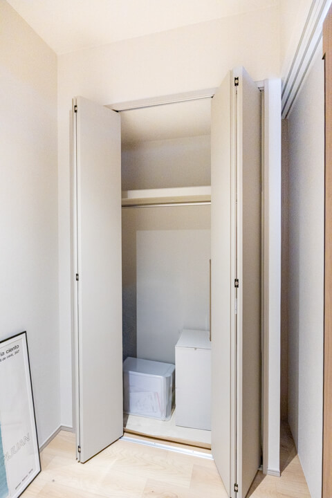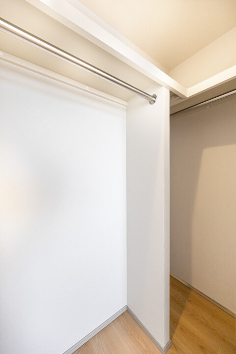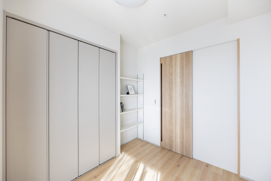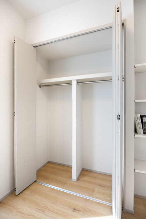 約4.5帖の洋室2は、独立性があって子ども部屋に使えそうな空間です。本棚としても使えそうな可動棚が設置されており、パイプハンガー付きのクローゼットもあります。収納スペースがしっかりと確保されていると、居住スペースをより有効的に使うことができるので嬉しいですね。