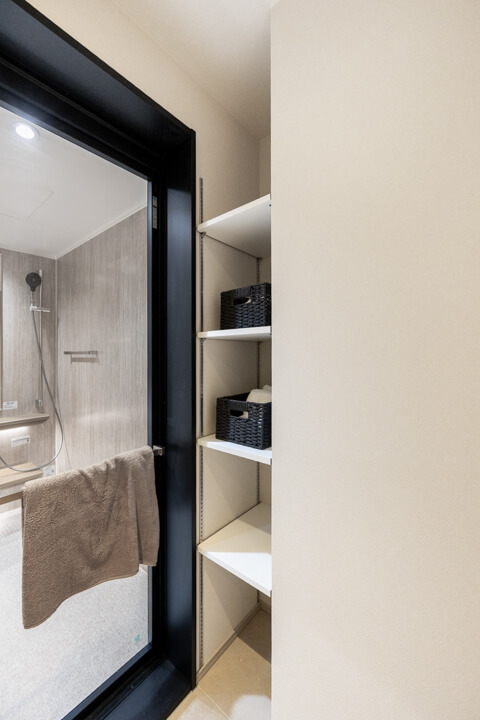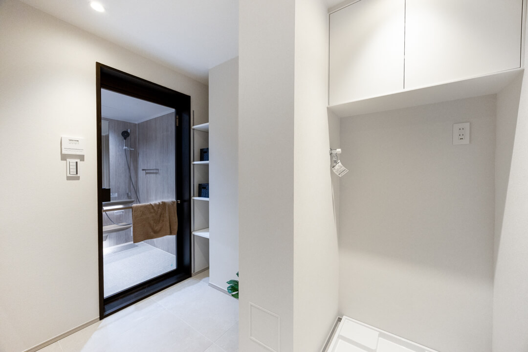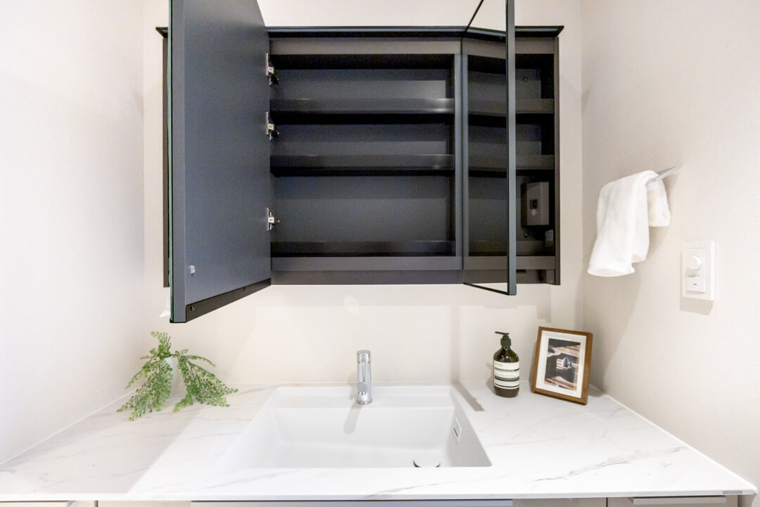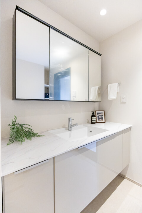 TOTO製の洗面化粧台は、三面鏡の中に化粧品などが収納できて使い勝手が良好です。カウンターと洗面ボウルが一体型になっているので、お手入れが簡単。洗面室の入口やは洗面化粧台の背面側には収納スペースが造られており、リネン類などもきちんと収納できそうです。