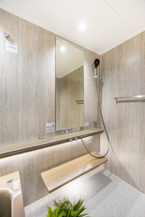 TOTO製のバスルームは、1620サイズでゆったりと入浴することができます。お風呂にゆっくり浸かるのが好きという方に嬉しい追い焚き機能を搭載。家族の入浴時間がずれてしまっても安心です。また、浴室乾燥機には暖房・乾燥・換気・涼風の機能がついており、一年中快適に過ごすことができます。