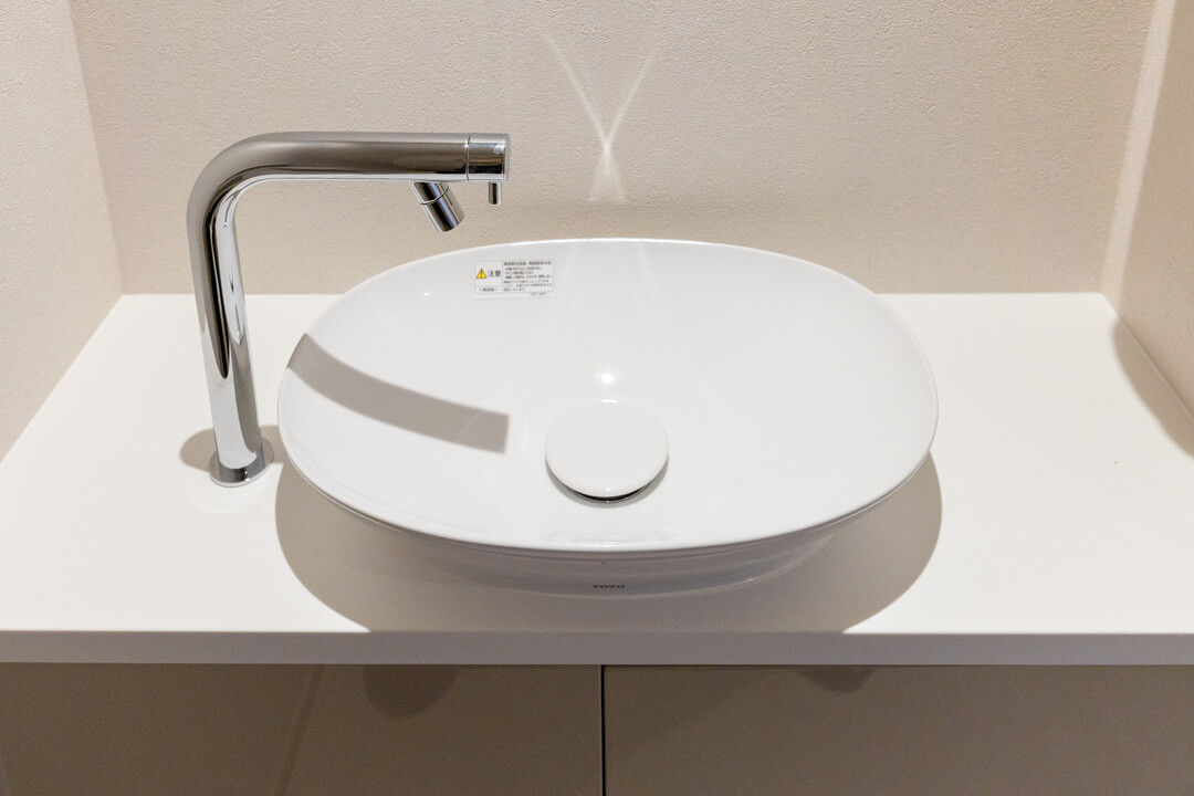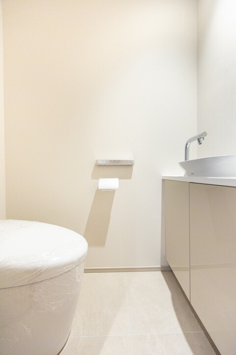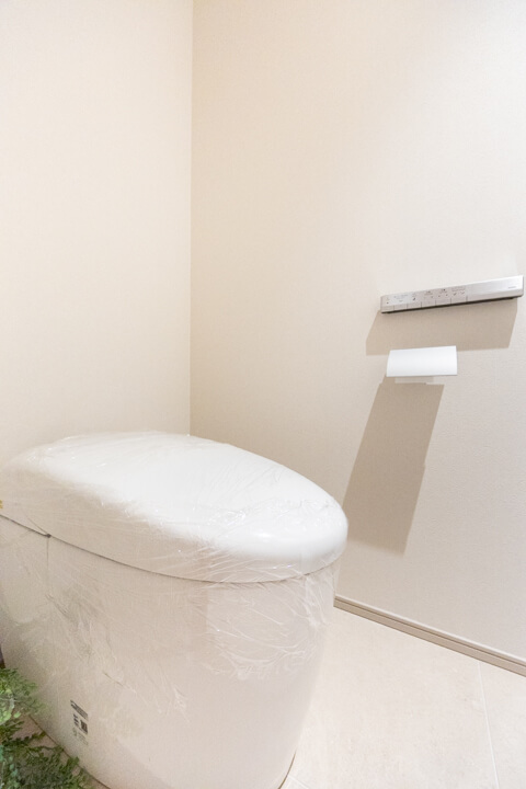 TOTO製のウォシュレット一体型のトイレです。タンクレスタイプなのですっきりとした印象に。また、別途で手洗い器が造られているので、すぐに手を洗うことができて衛生的です。下部には棚収納スペースもあります。
