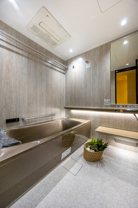 浴槽にはヘッドレストが付いていて、首元を優しく支えてくれます。さらに、ヘッドレストの下と腰の位置からお湯が流れる「楽湯」機能も搭載されていて、全身をしっかり温めることができます。気分や好みに合わせて流量を変えることができ、至福のリラックスタイムになりそうですね。