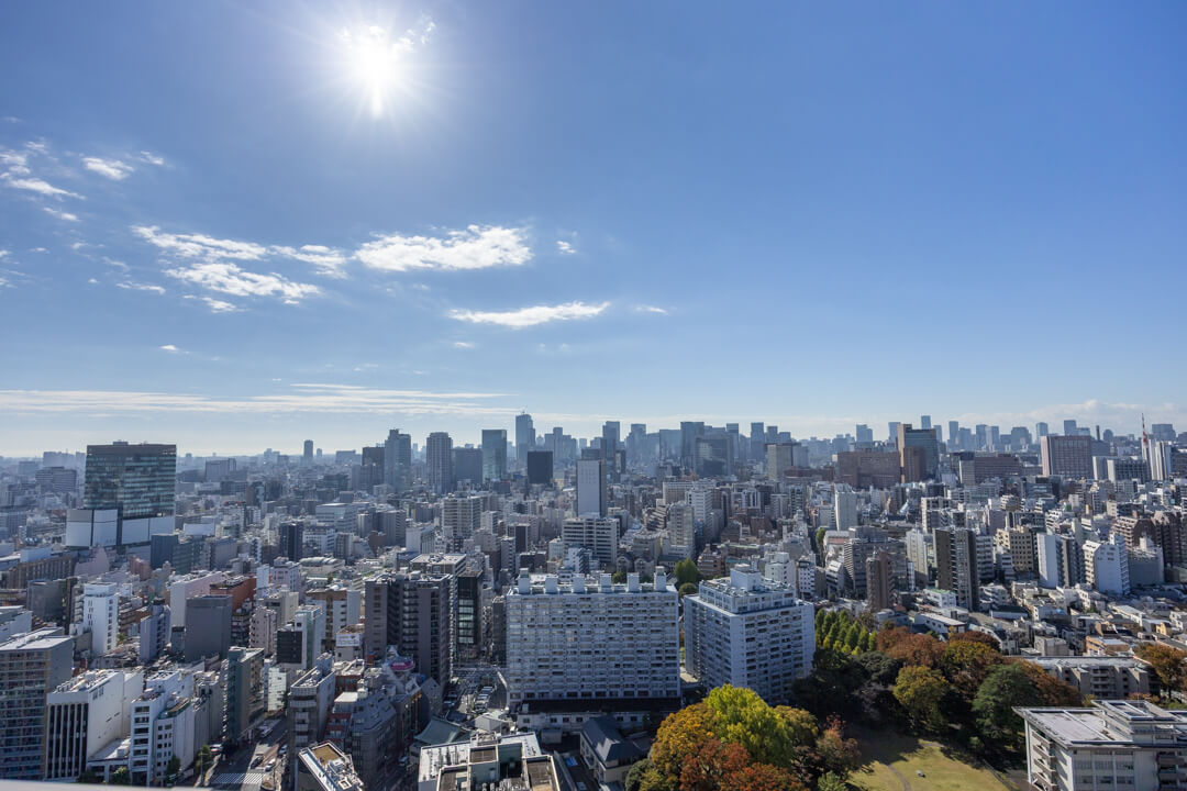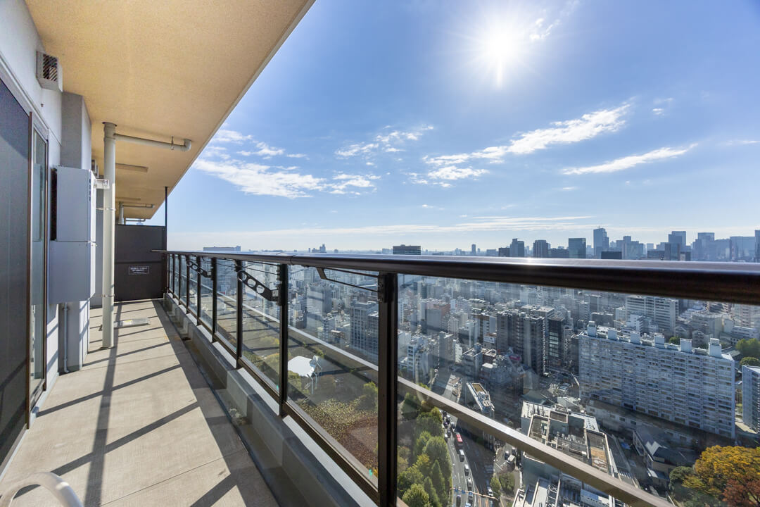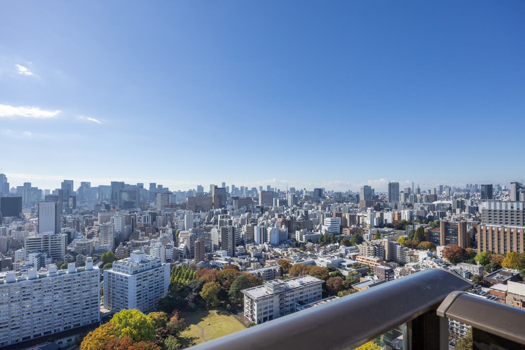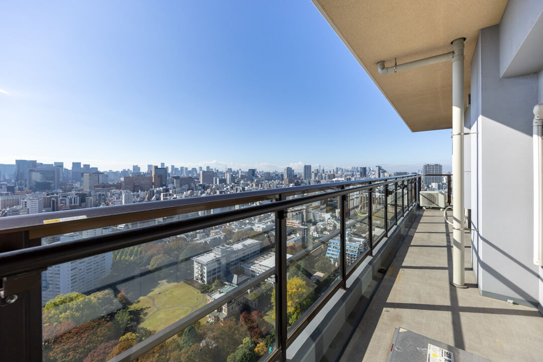 約18.75㎡、横幅約12mのワイドバルコニーは、南向きのため日当たりが良好です。32階部分ということもあり、目の前には開放感溢れる眺望が広がっています。不忍池や旧岩崎邸庭園の緑なども望めて都心の景色を堪能できますよ。
