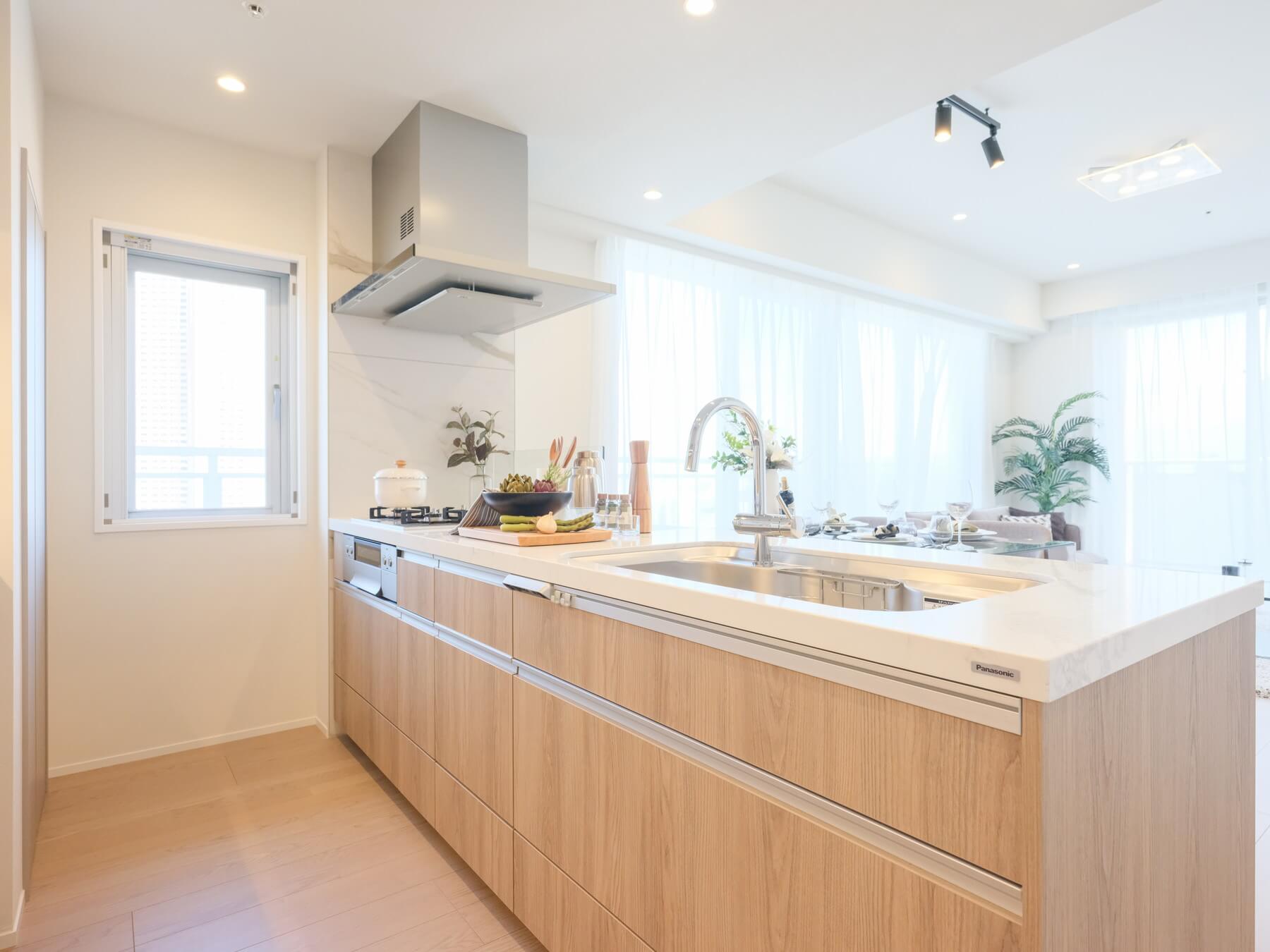 リビングダイニングを見渡せる、開放的な対面キッチン。家族のコミュニケーションが増えそうです。グリル付3口ガスコンロ・食洗機内蔵で快適なキッチン時間に。木目デザインが美しく、家具のようにお部屋に調和します。