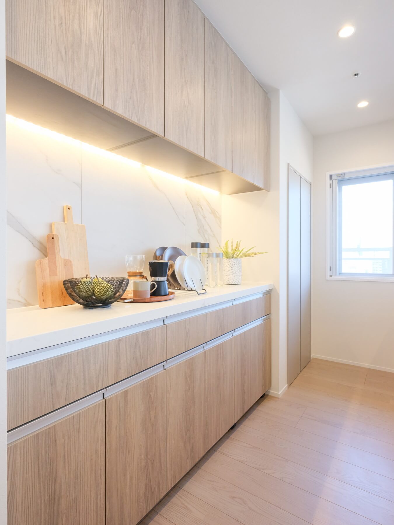背面にはキッチンと同じデザインのカップボードを完備。収納性が高く、食料品のストックや食器類をたっぷり収納できます。間接照明が上品な印象をもたらすのもポイントです。