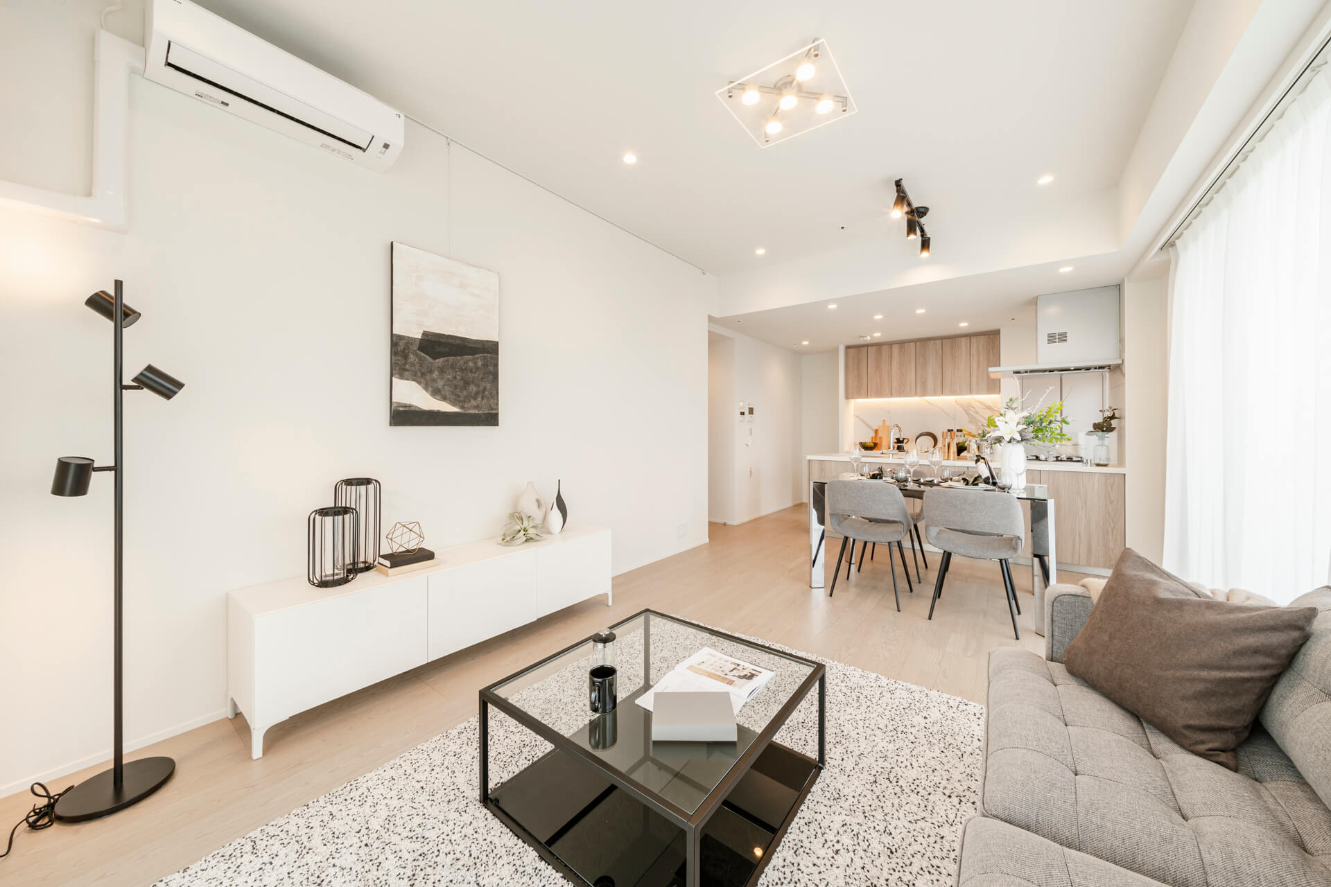 約17.7帖のLDK。明るい光が届く2面バルコニーで、開放感たっぷりです。風通しの良さも魅力的ですね。ホワイトのクロスとペールグレーのフローリングが、ナチュラルながらも気品のある雰囲気を演出。ピクチャーレールを活用し、自分好みの空間づくりを楽しめるのもポイントです。