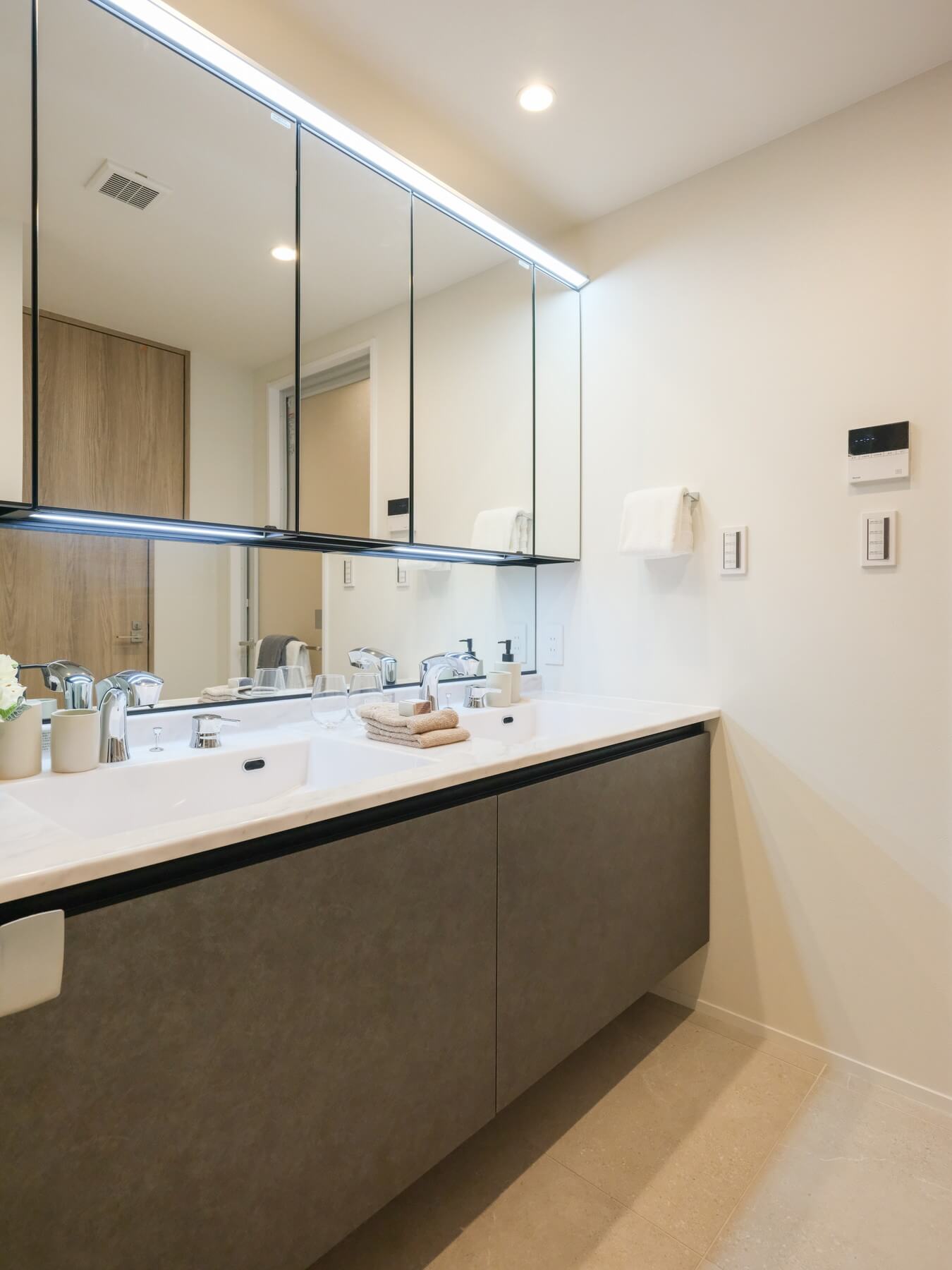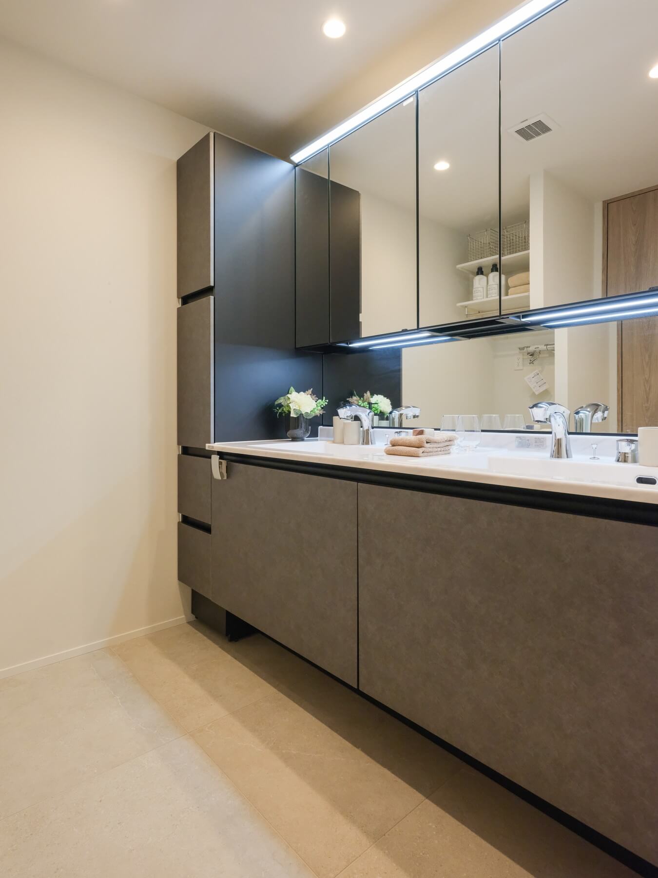 2つの洗面ボウルが並ぶ、ゆとりの洗面化粧台。2人同時に使用でき、忙しい朝の身支度も安心です。左手には洗面台と同じデザインのリネン庫があり、収納性の高さも魅力です。