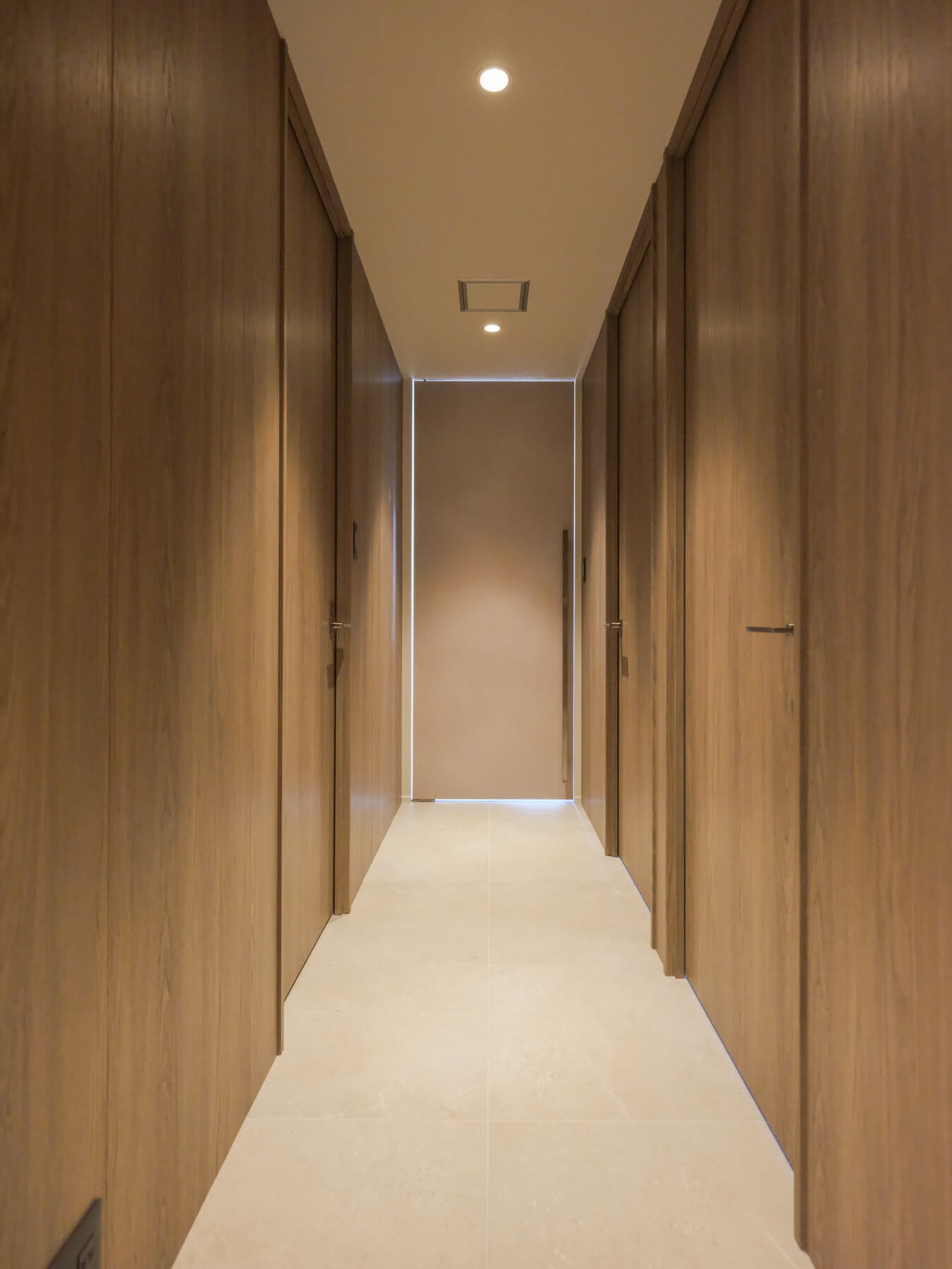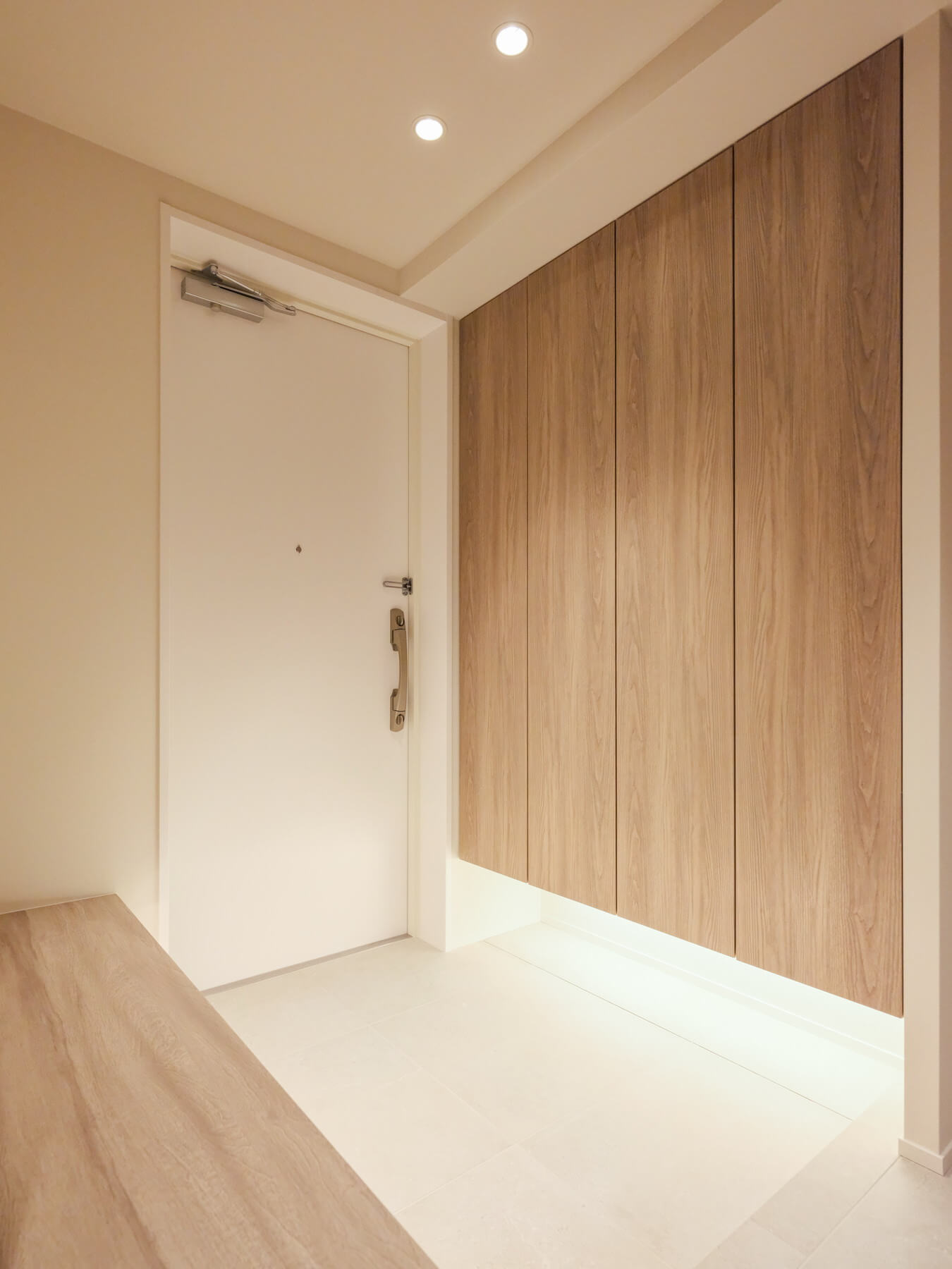 フットライトが幻想的な雰囲気を醸し出す玄関。靴の脱ぎ履きに便利なベンチが設置されています。対面側にはトールタイプのシューズボックスがあり、散らかりがちな靴をすっきり収納可能。廊下は木目で統一されていて、洗練されたぬくもりを感じます。