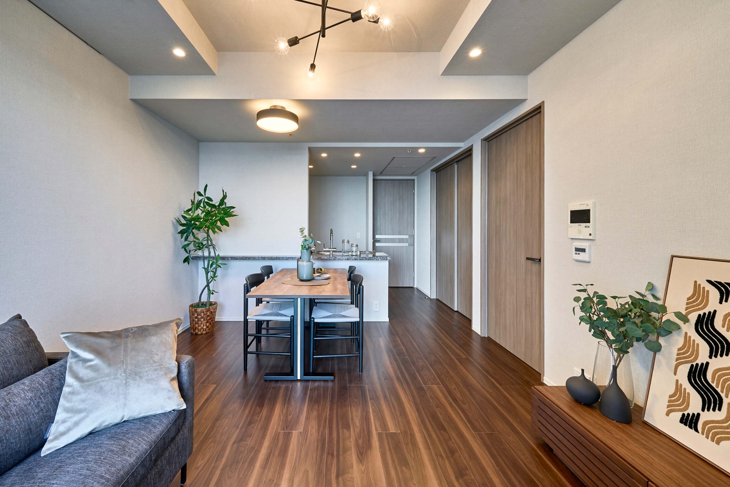 約10.0帖のリビングダイニング。南向きで自然な光が入り、37階部の高層階につき室内からでも眺望良好です。バルコニーの手すりが透明になっているので景色を遮らず開放感もよりUP。また、リビングにはピクチャーレールが付いていてキズつけずにアートや写真が飾れます。
