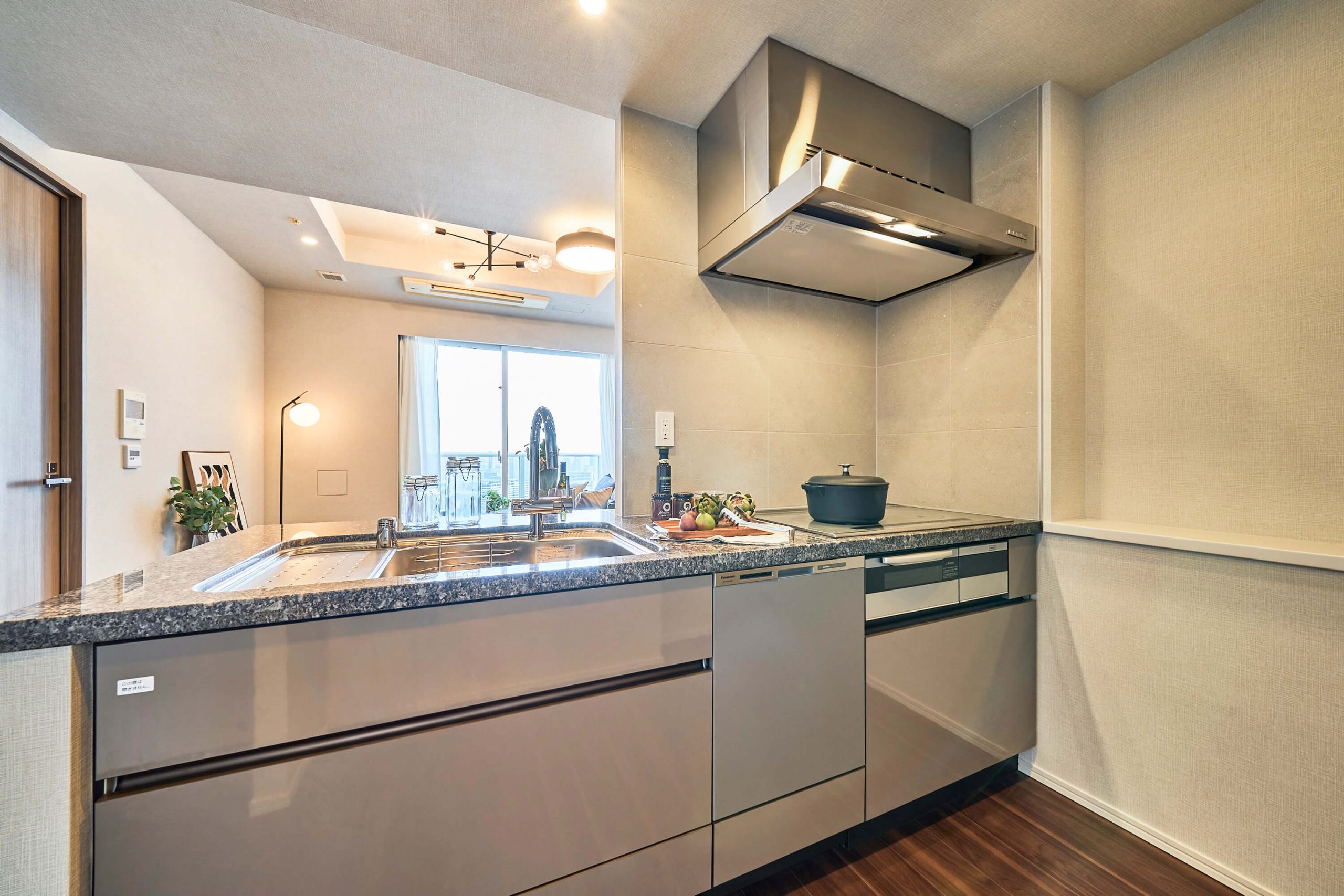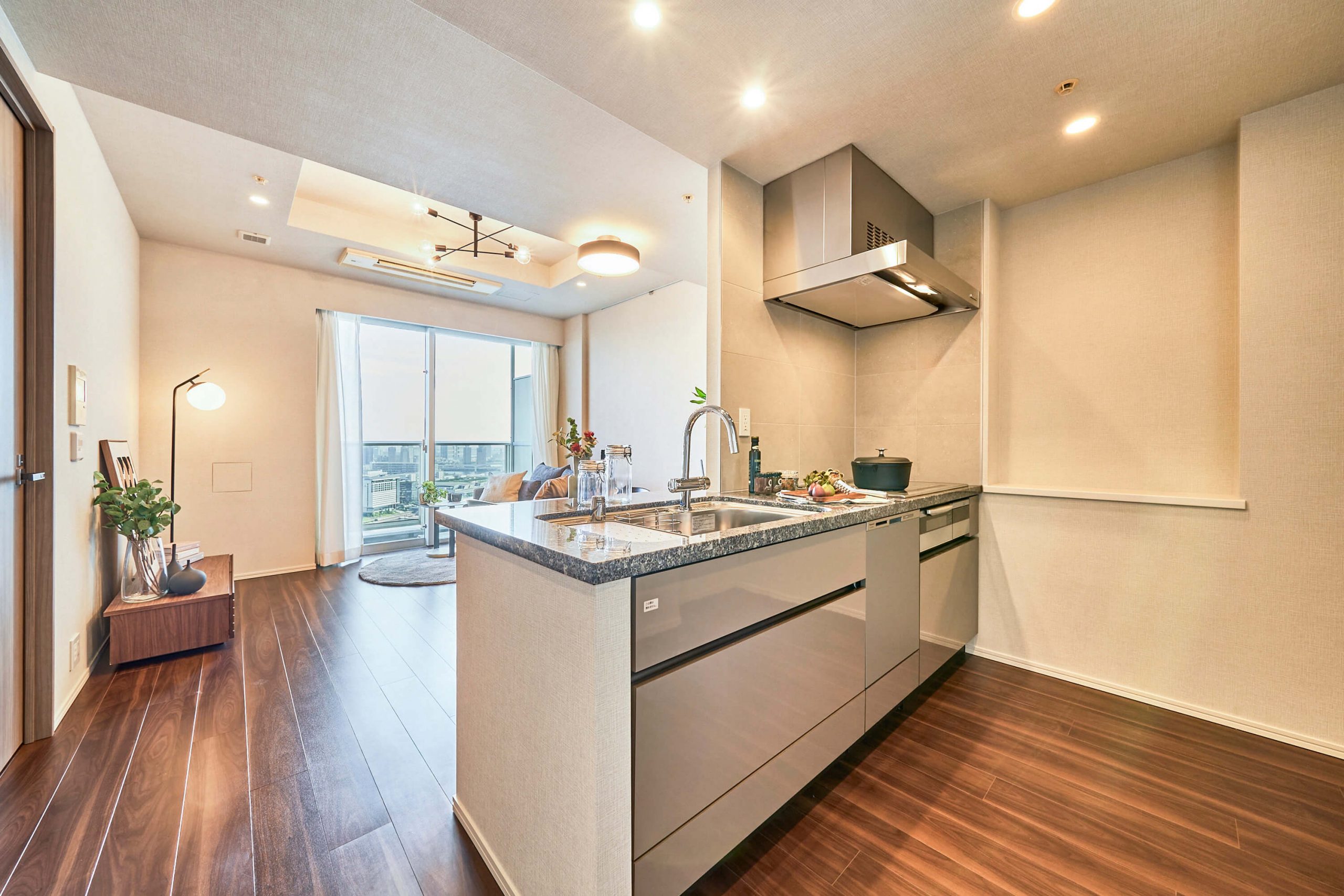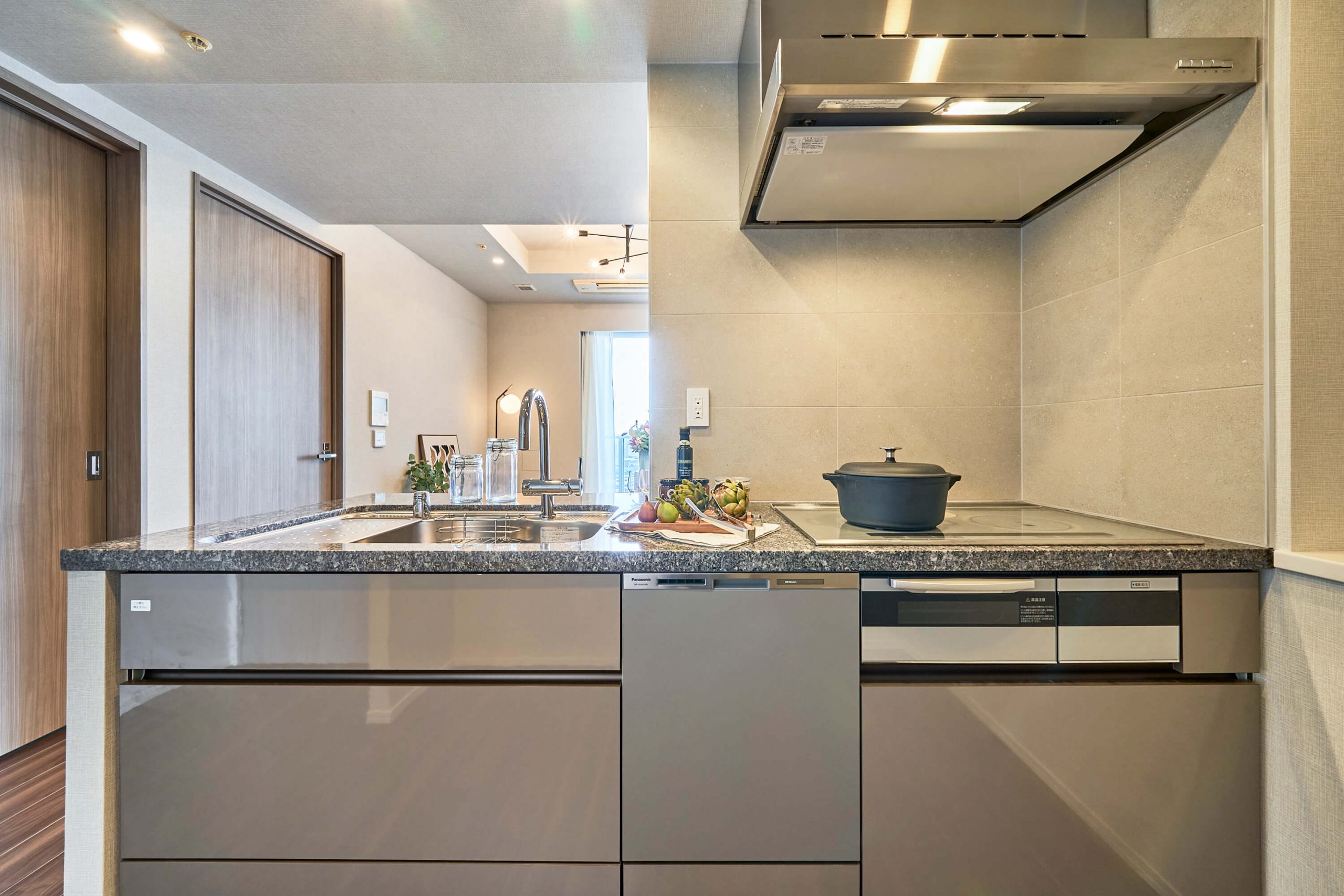 開放的なオープンキッチン。家族やゲストと会話がしやすく、小さなお子さんがいるご家庭では子どもの姿も見守れます。手入れがしやすいIHクッキングヒーター、家事の時短に心強い食洗機、生ごみの処理に便利なディスポーザー付きで設備も充実しています。