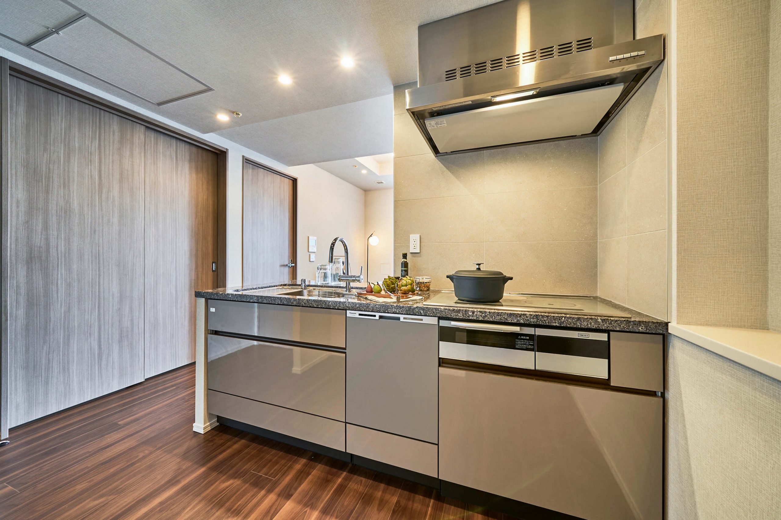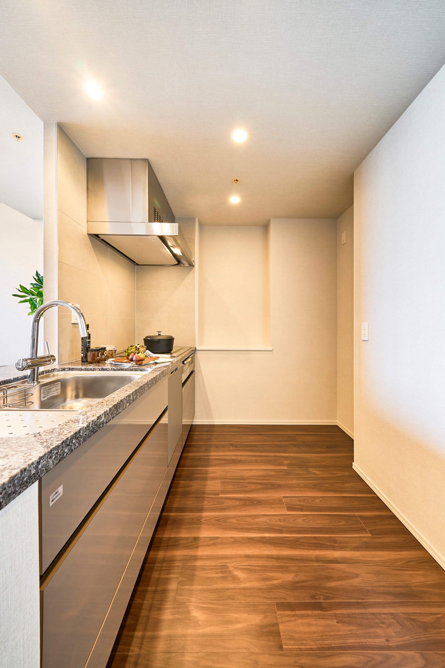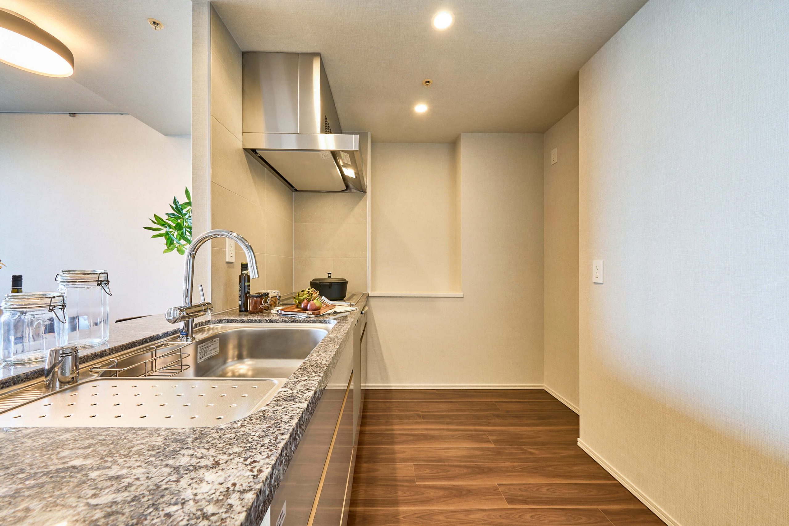 開放的なオープンキッチン。家族やゲストと会話がしやすく、小さなお子さんがいるご家庭では子どもの姿も見守れます。手入れがしやすいIHクッキングヒーター、家事の時短に心強い食洗機、生ごみの処理に便利なディスポーザー付きで設備も充実しています。