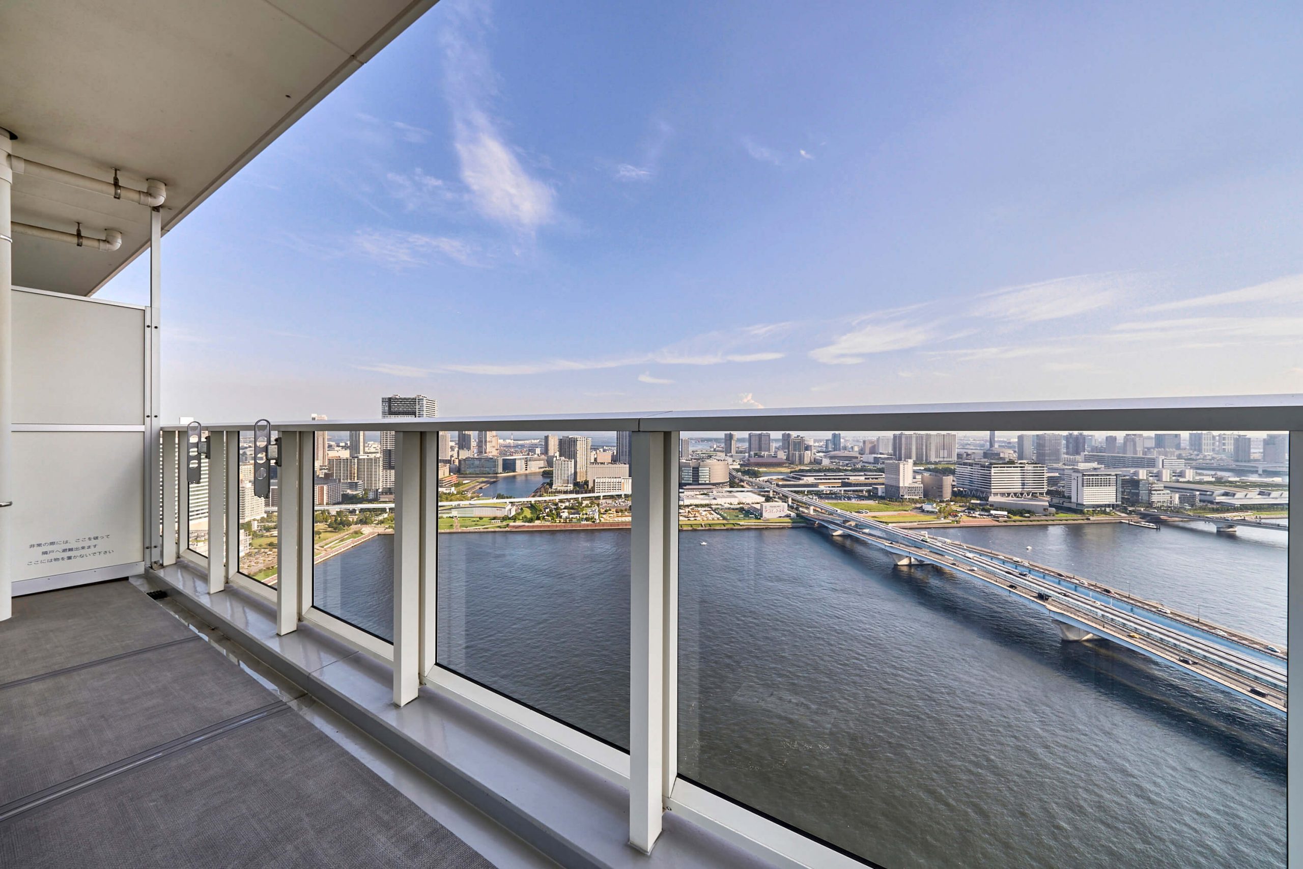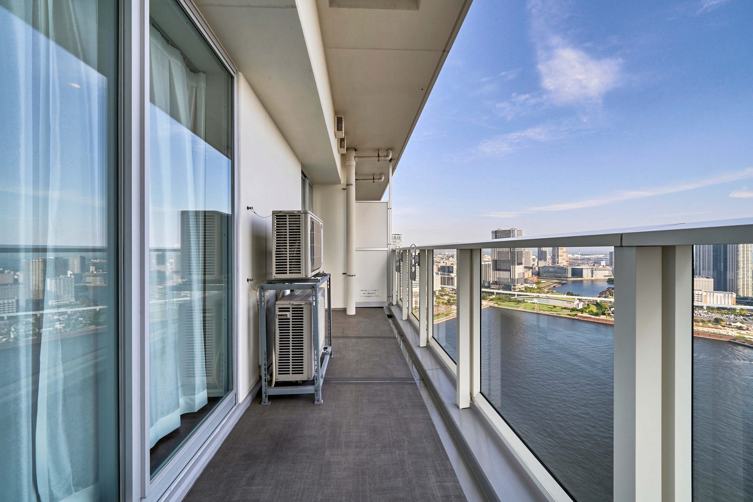リビングダイニングと洋室1に面したバルコニー。約9.87㎡ほどの広さです。南向きで陽当たり良好。バルコニー手すりが透明になっていて、景色を遮らず開放感たっぷりです。37階部の高層階につき眺望も良好。運河とビル群が望めます。