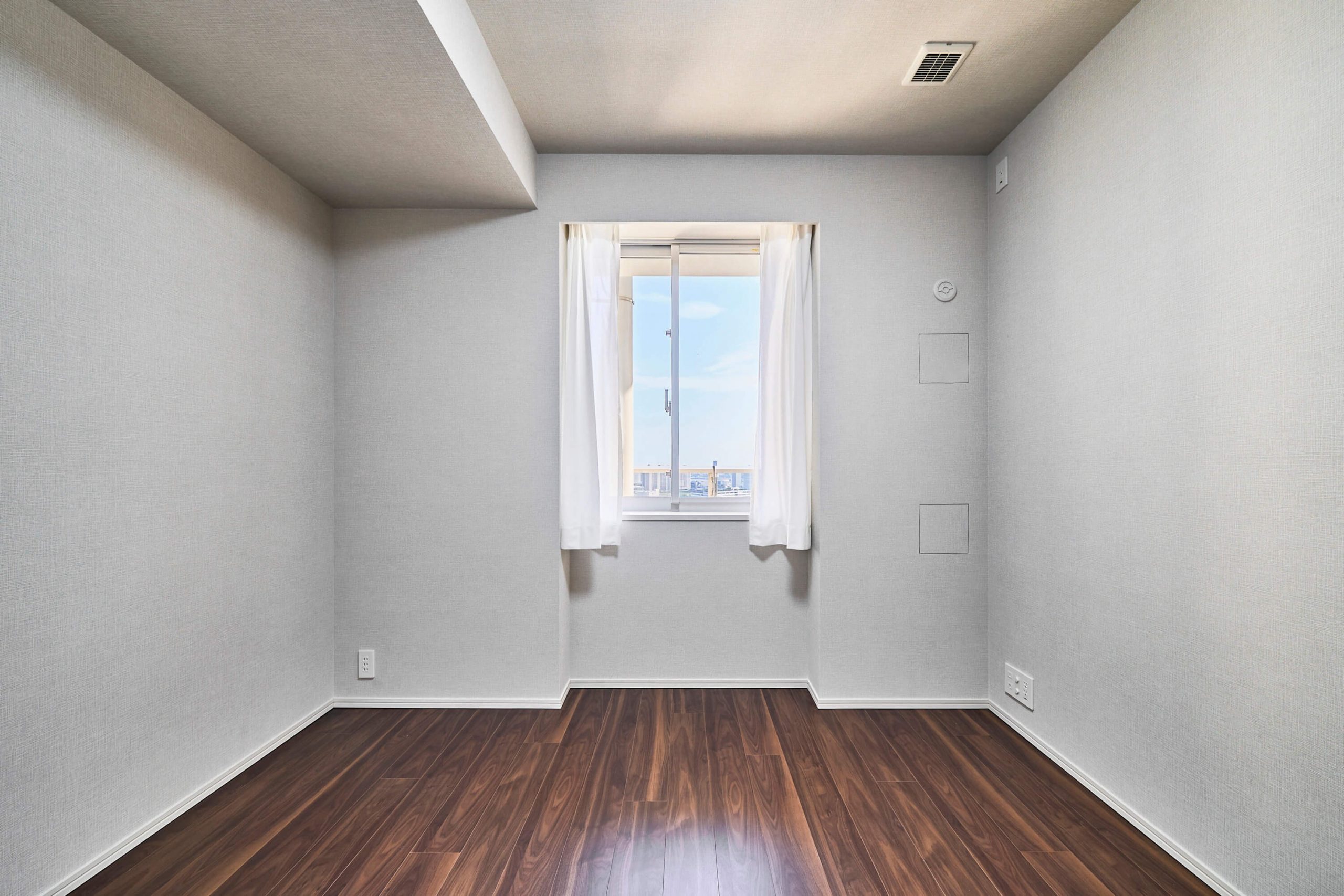 約6.1帖の洋室1。南向きで自然な光が入るお部屋で、窓はバルコニーに面していて眺望も良好。クローゼットも備わっています。