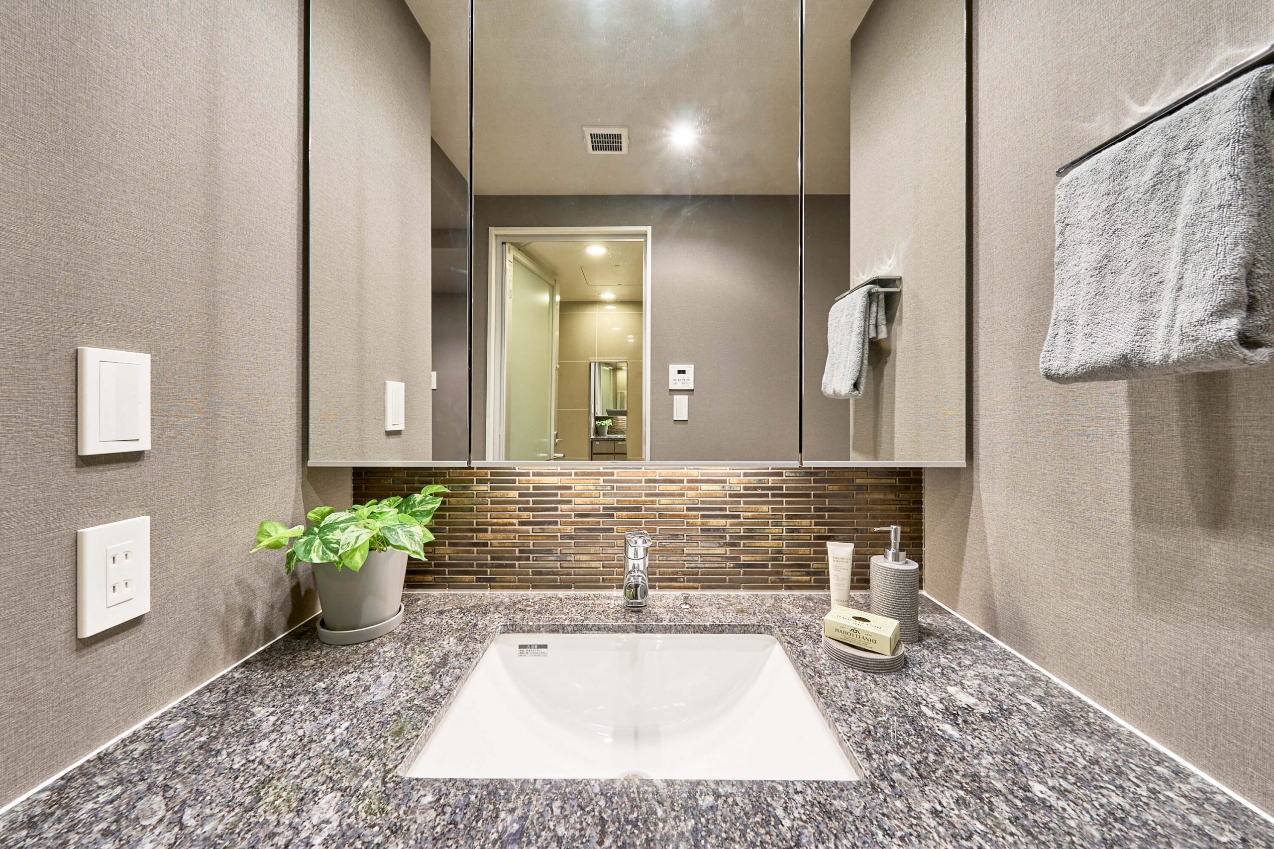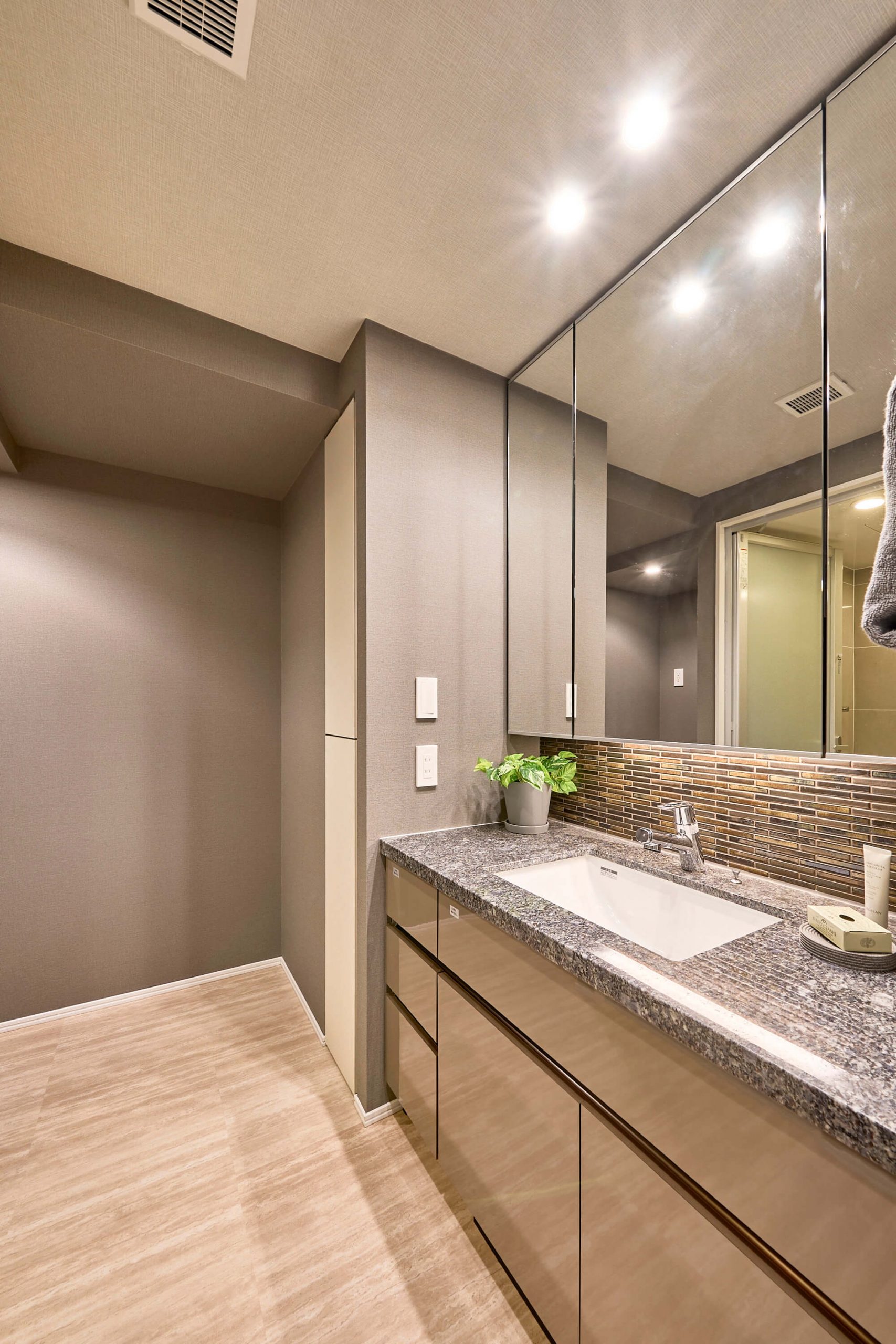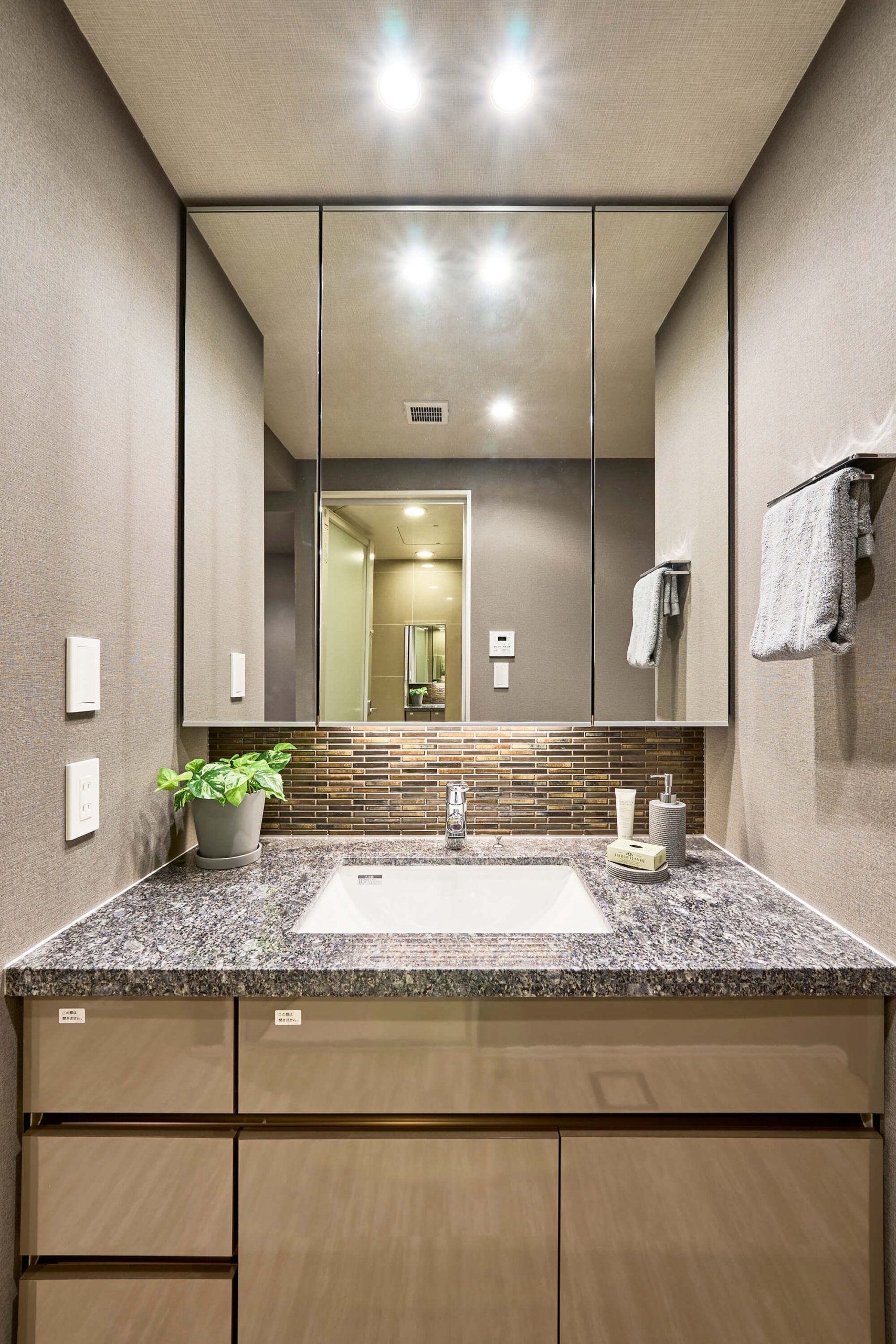 上質な雰囲気と重厚感が漂うホテルライクな洗面化粧台。洗面まわりの小物がすっきり整頓できるミラーボックス付きで、いつでも整った空間をキープできそうです。別途、リネン庫も備わっています。