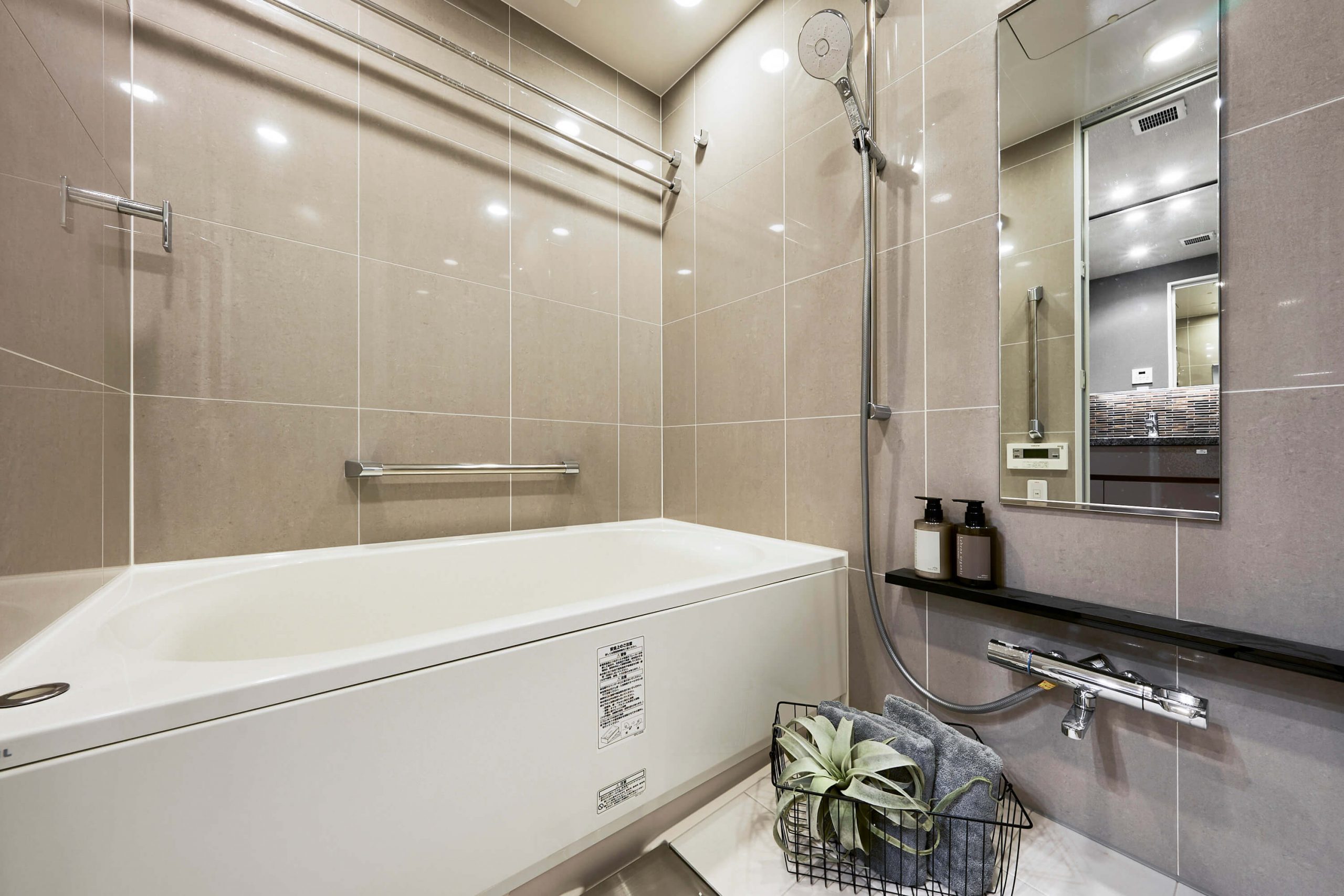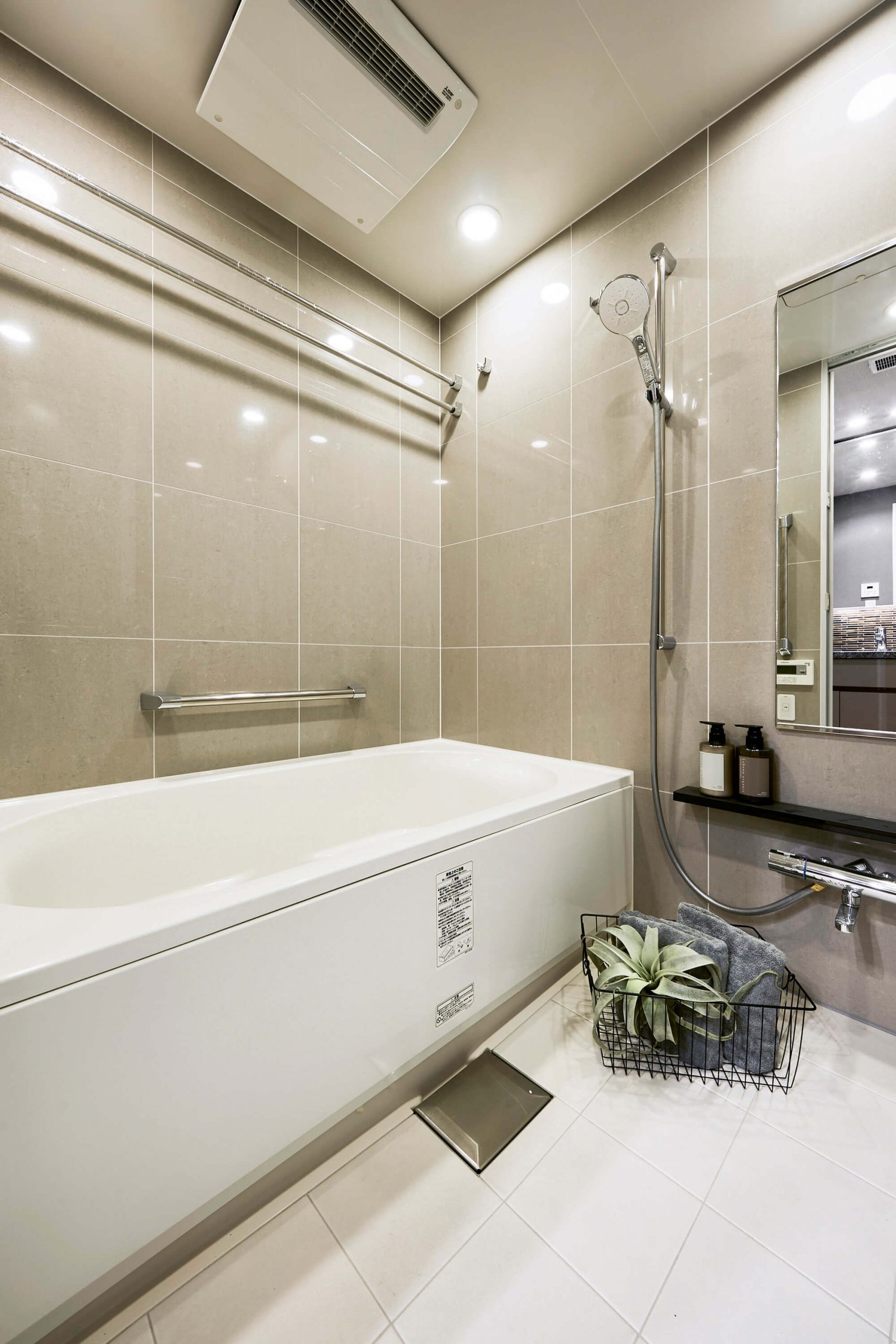 タイル貼りのバスルーム。1418サイズです。浴室換気乾燥機とランドリーパイプ2本付きで、雨の日や冬場の洗濯にも困りません。