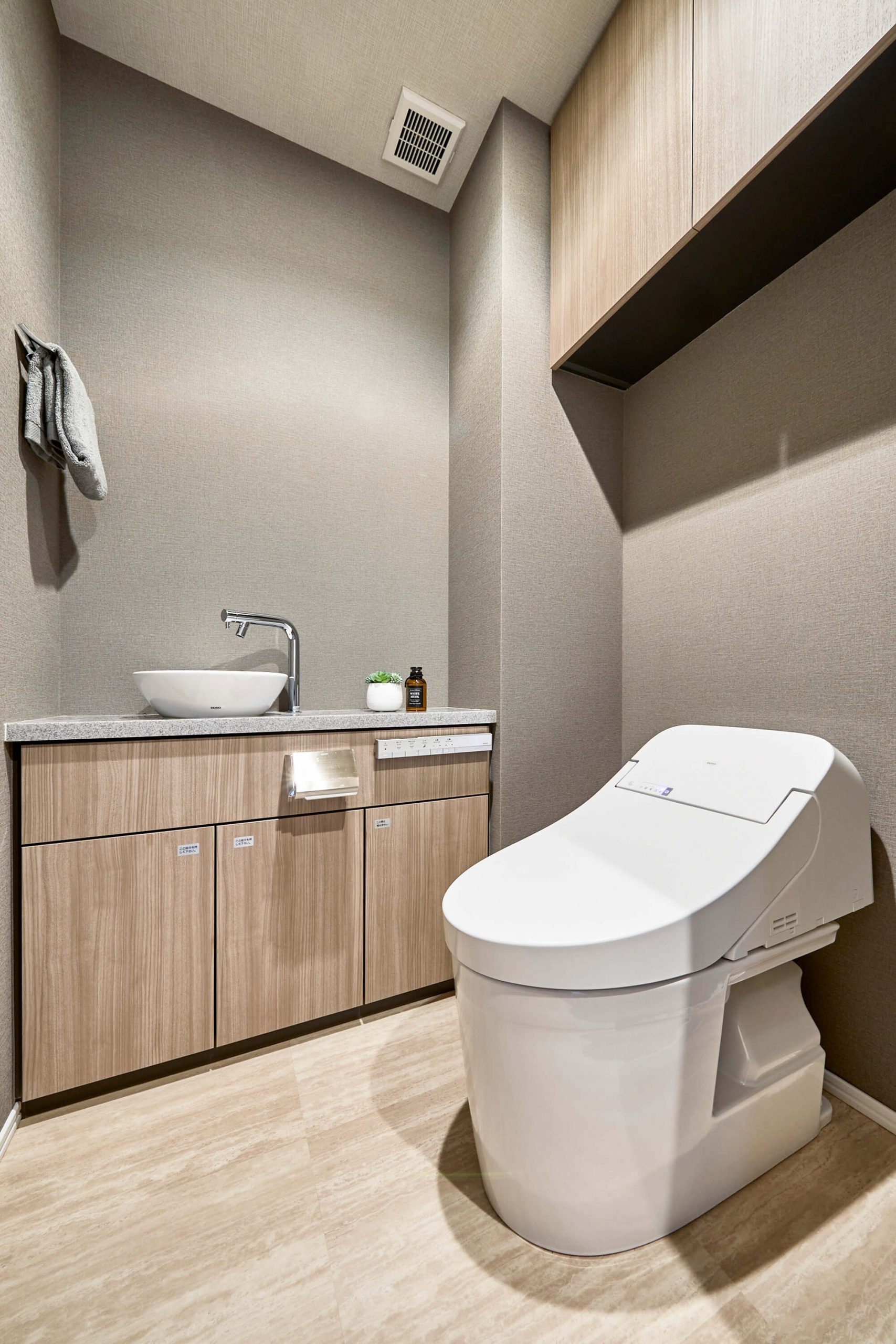 廊下に面したレストルーム。空間がすっきり見えるタンクレストイレです。手洗いカウンター、ウォシュレット、収納スペースが備わっています。