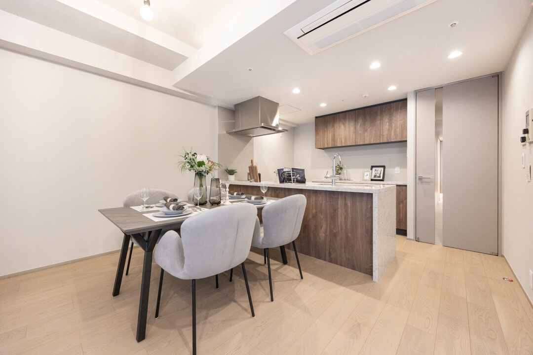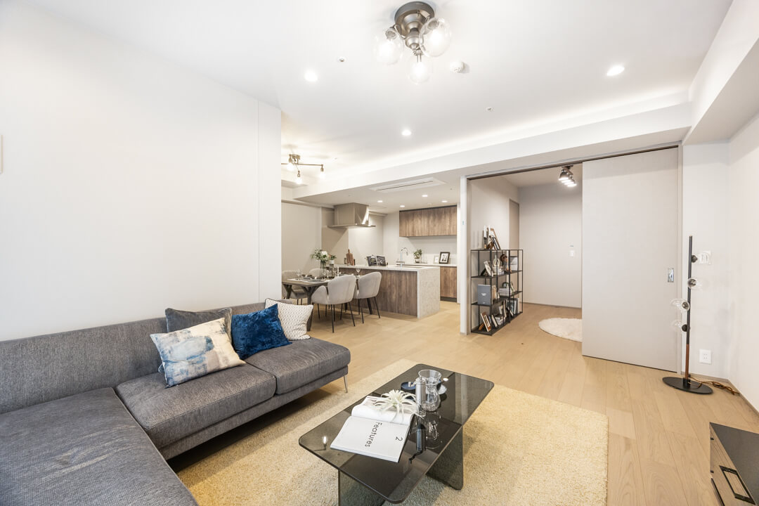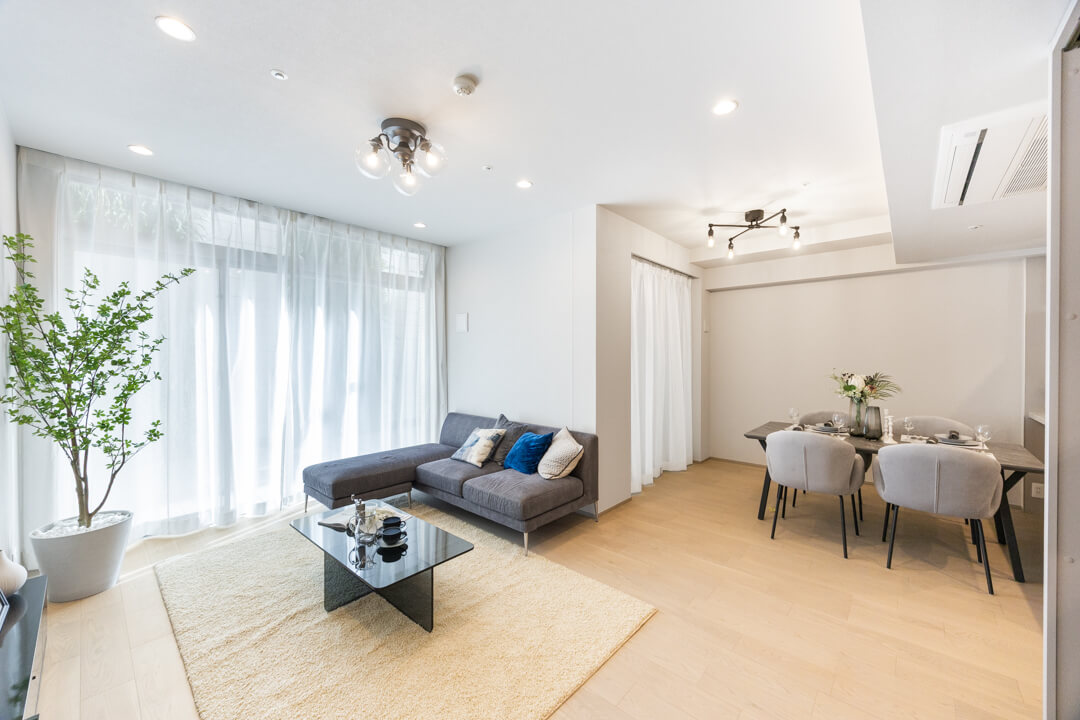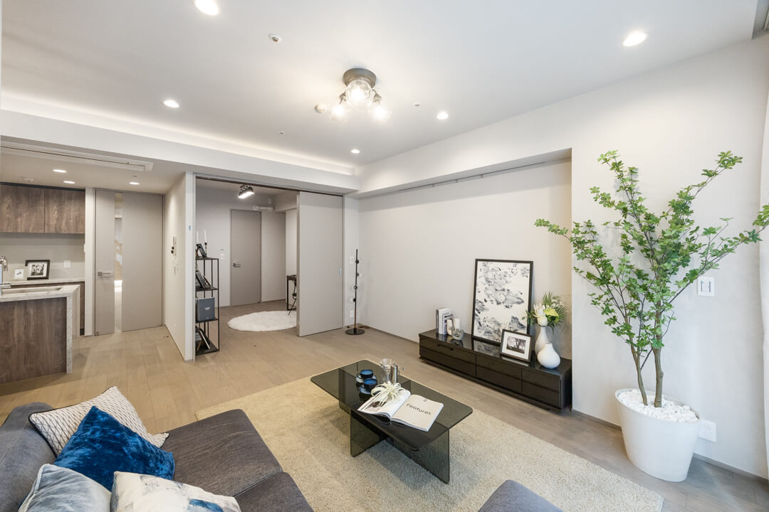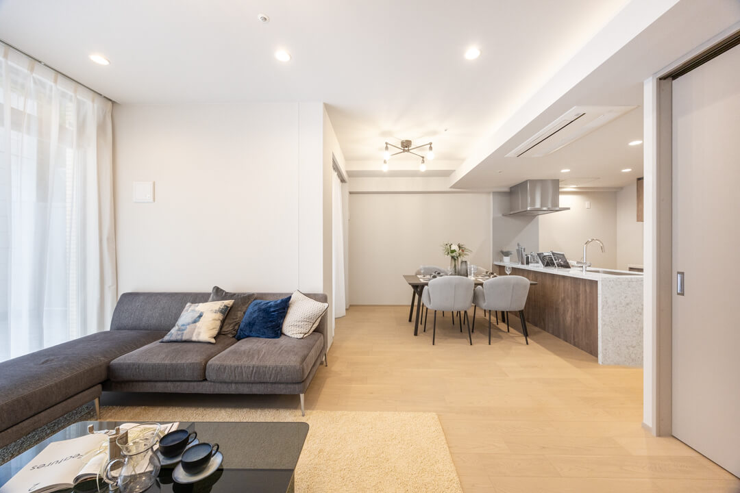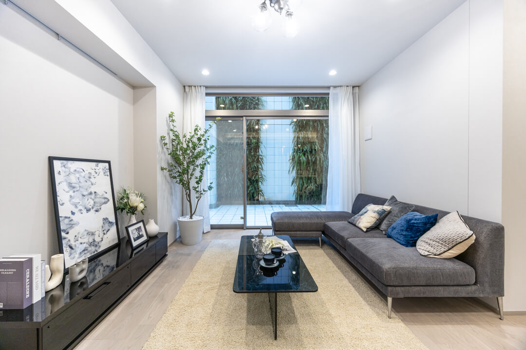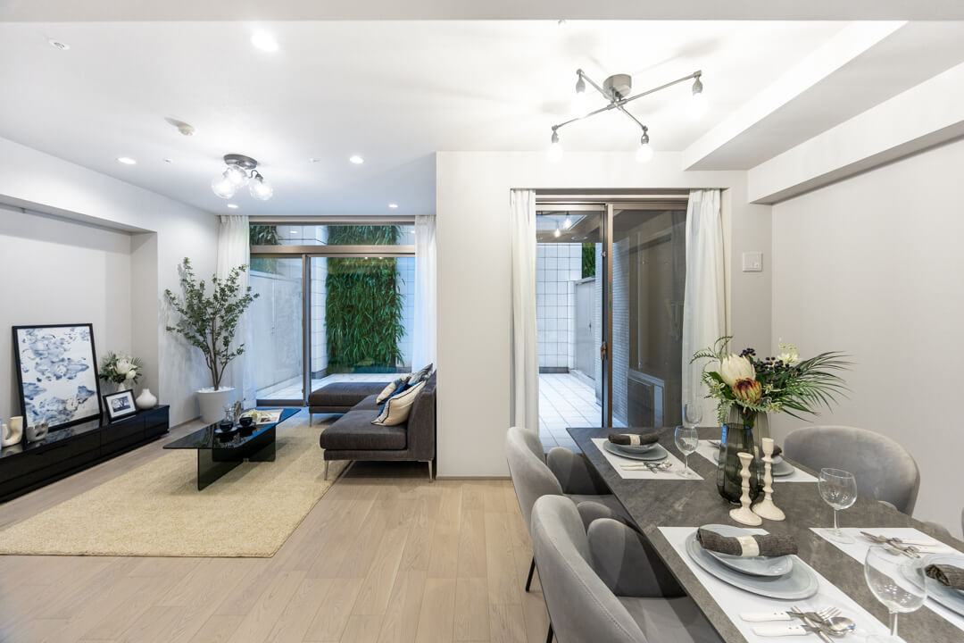 東京メトロ千代田線「赤坂」駅から徒歩6分。今回ご紹介する物件は約76㎡の2SLDKです。1階部の特権、約28㎡のゆとりテラス付きで、第二のリビングのように使えます。テーブルセットを並べ、ブランチやコーヒータイム、読書などを楽しむのもいいですね。LDKも約19帖で家族でゆったり過ごせる広さ。カーテンを開けるとテラスを眺めることができ、空間の奥行きが広がります。