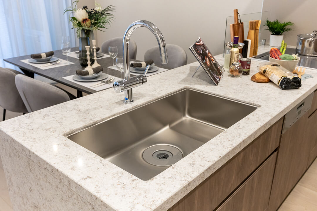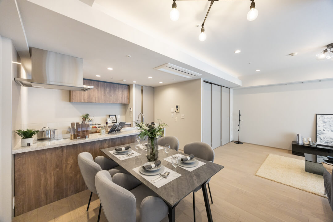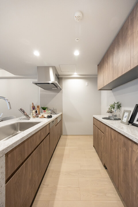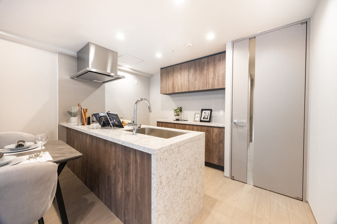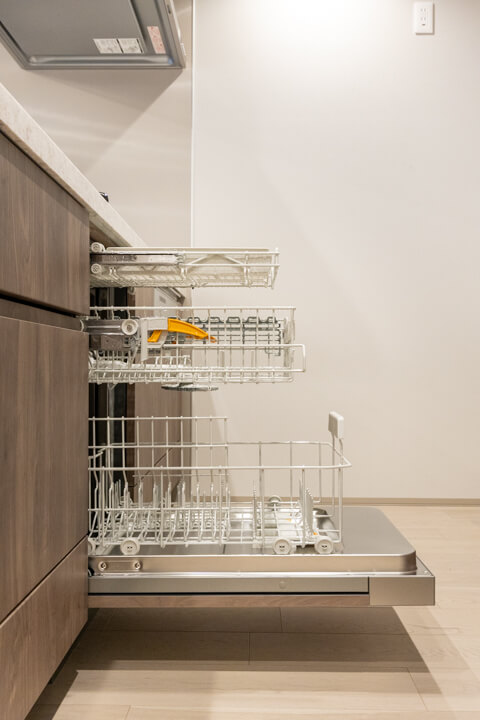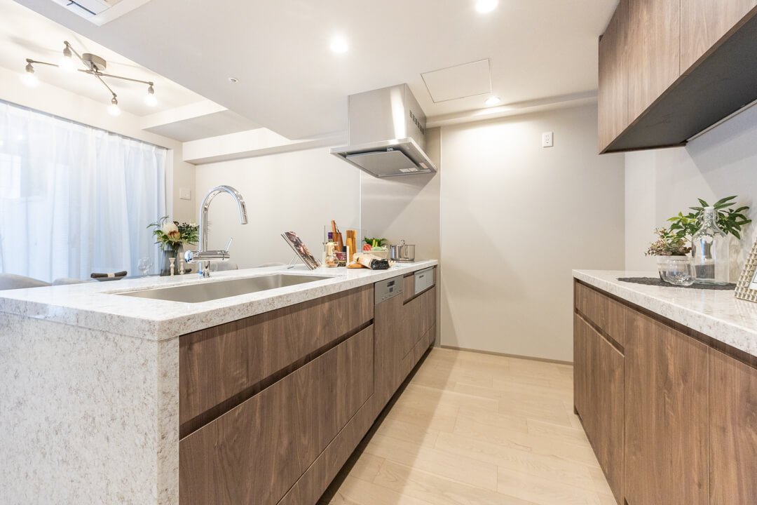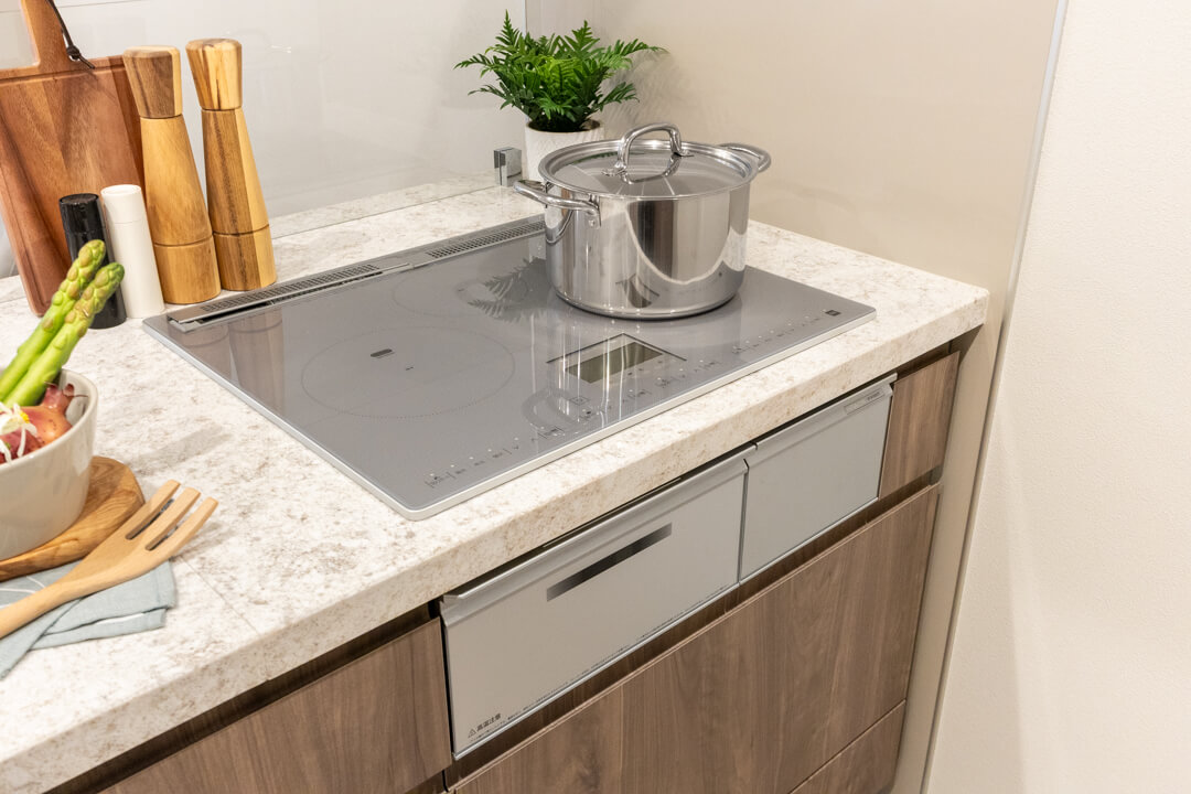 リビングダイニングが見渡せる開放的なオープンキッチン。家族やゲストと会話がしやすく、小さなお子さんがいるご家庭では子どもの姿を見守れます。生ごみの処理に便利なディスポーザー、家事の時短に心強いミーレ製の大型食洗機、手入れがしやすいIHクッキングヒーター付きで設備も充実。カップボード付きで収納スペースもしっかりと確保されています。