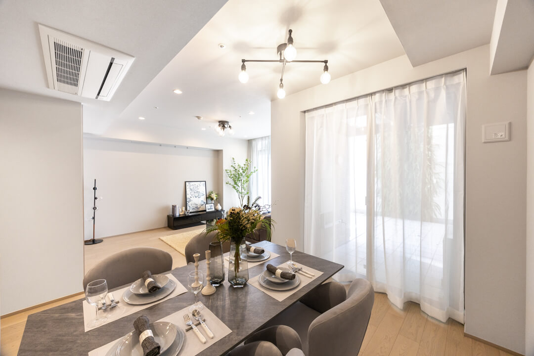 キッチンスペースを含め、約19.3帖のLDK。家族でゆったり過ごせる広さです。午前中から光が感じられる南東向きで窓も大きく開放的です。窓はテラスに面していて、カーテンを開ければ奥行きも広がります。