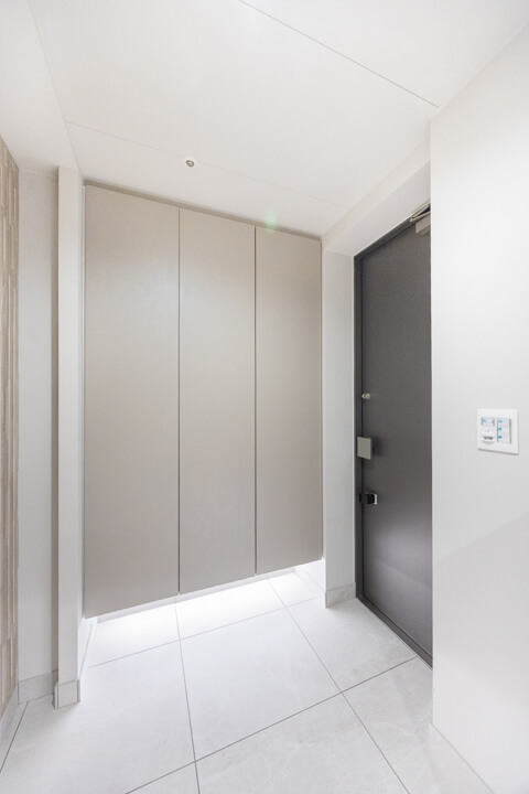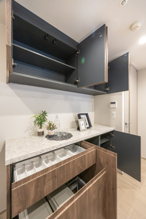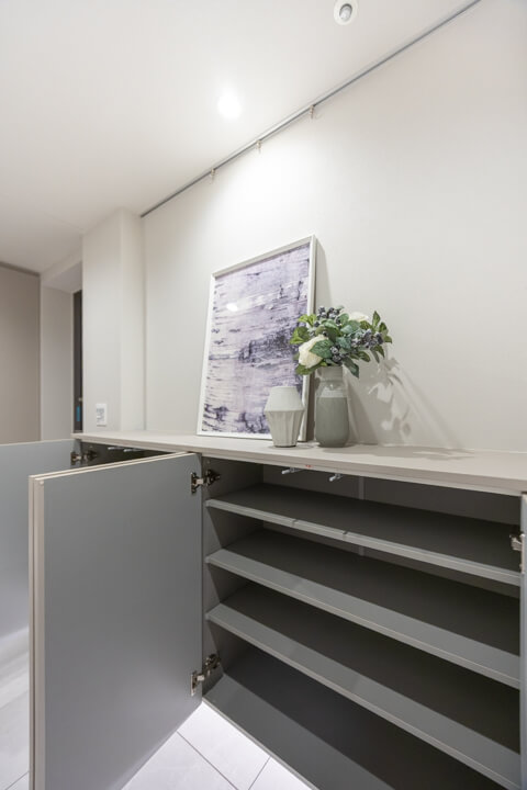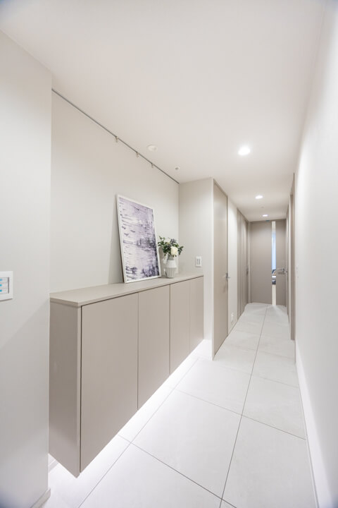 玄関にはシューズボックスを完備。足元をやさしい光で照らしてくれるフットライト付です。また、廊下にもカウンター収納が備わっていて、こちらにも靴や小物類の収納が可能。カウンターにはアートや季節の花を飾って空間に彩りをプラスできます。ピクチャーレールも備わっていますよ。