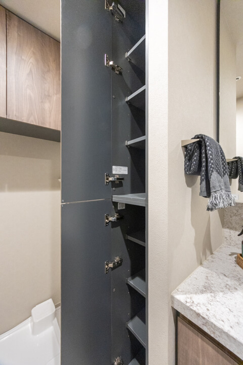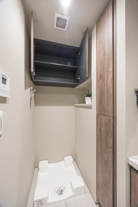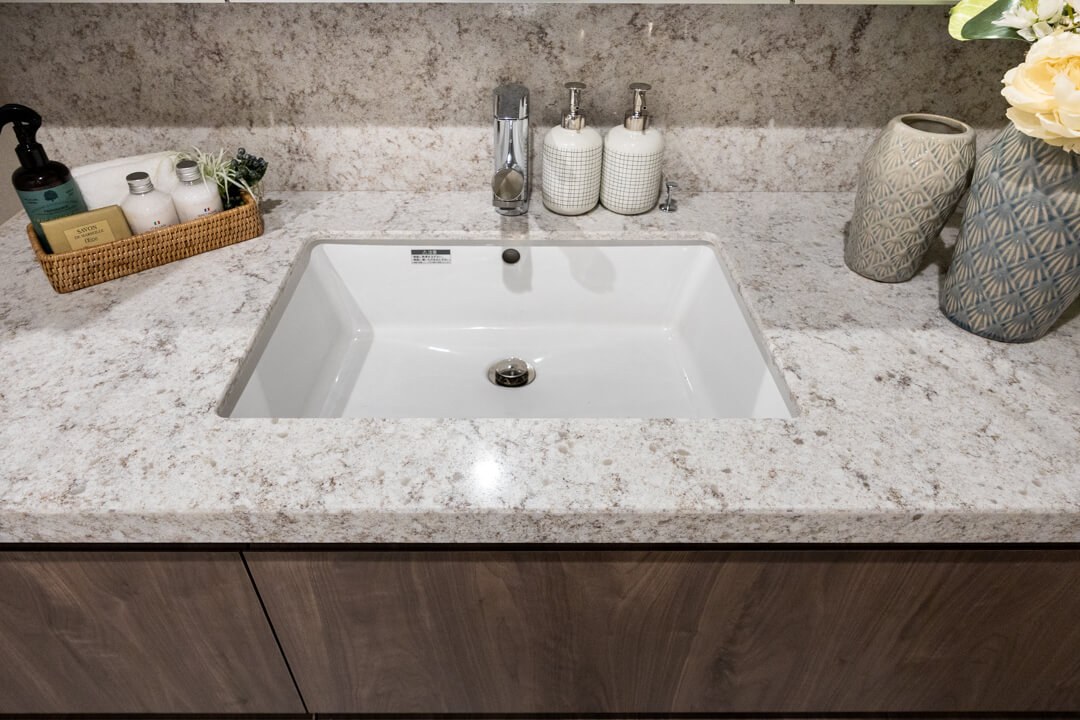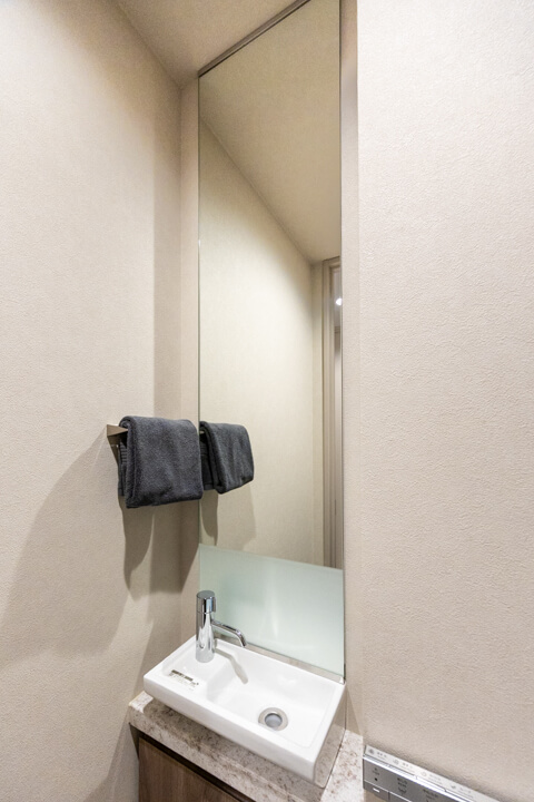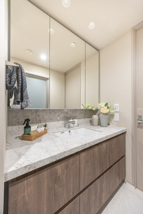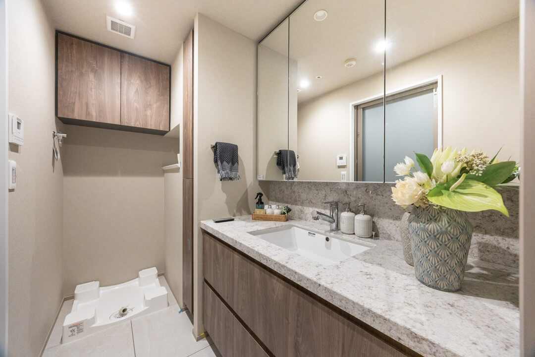 石目調のカウンターで上質な雰囲気が感じられる洗面化粧台。洗面まわりの小物がすっきり整頓できるミラーボックスや、モノの出し入れがしやすい引き出し式のキャビネット付きで使い勝手の良さがポイントです。洗面台とは別途、リネン庫も備わっています。