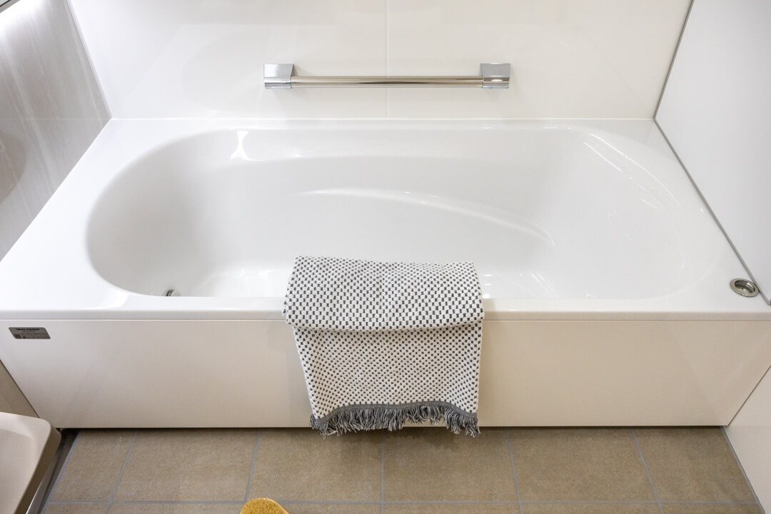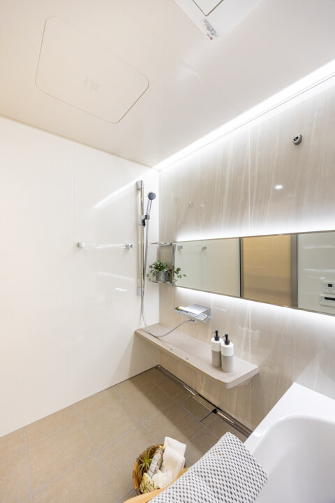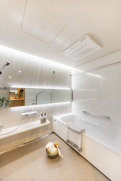 1620サイズのバスルーム。照明使いが美しい演出性の高いデザインです。追い炊き機能の他、ミストサウナ・乾燥・換気・暖房の機能が備わっていて、一年中快適にバスタイムが楽しめます。ランドリーパイプも付いていて、雨の日や冬場の洗濯にも困りません。