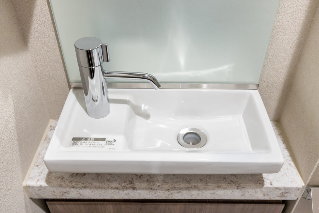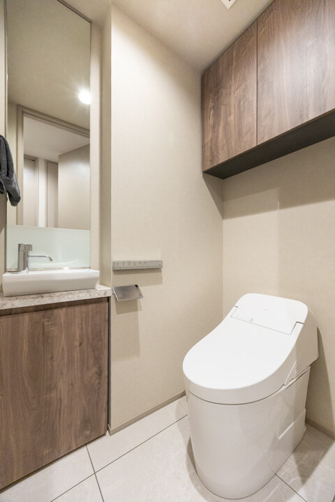 廊下に面したレストルーム。空間がすっきり見えるタンクレストイレです。独立型の手洗い器、ウォシュレット、収納スペースも備わっています。