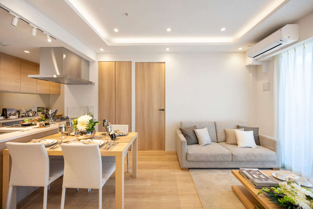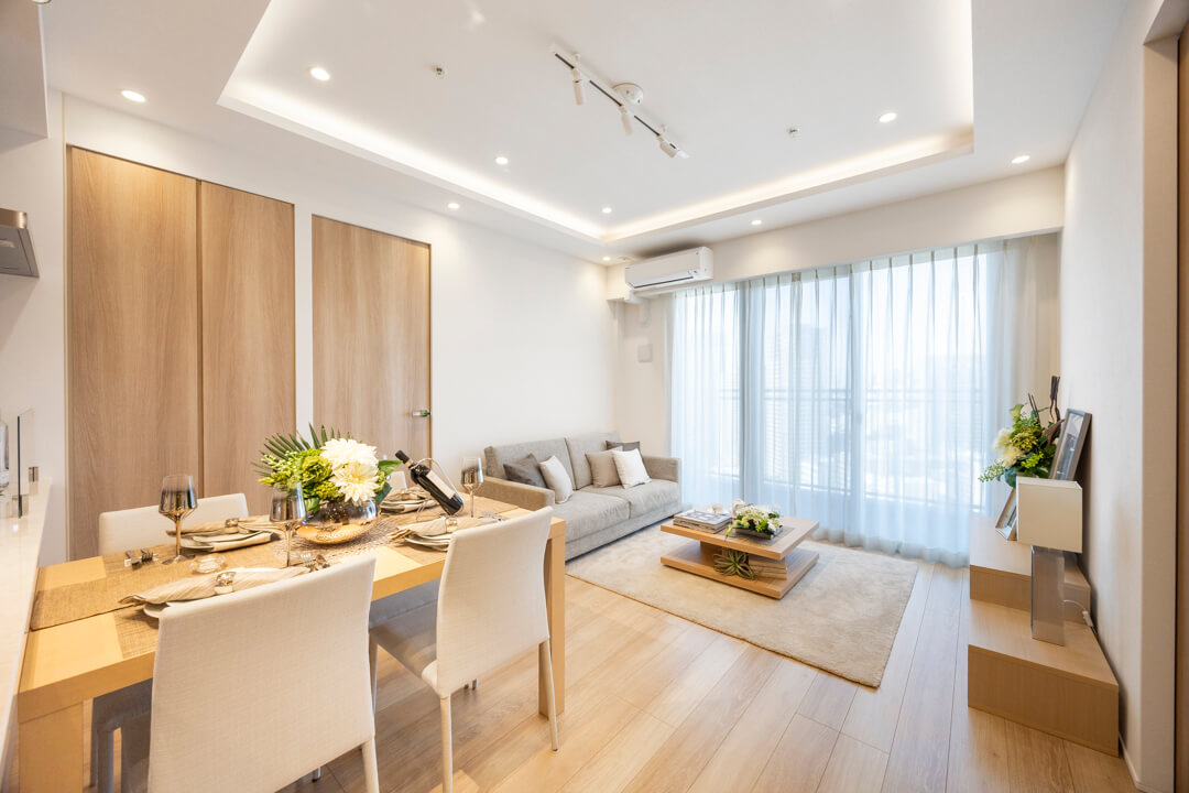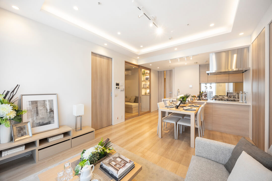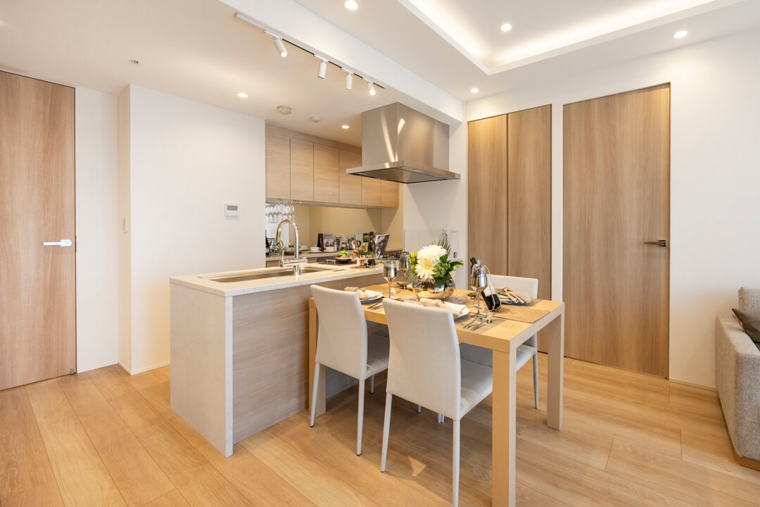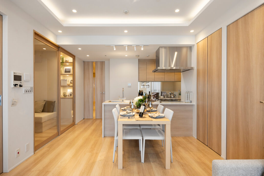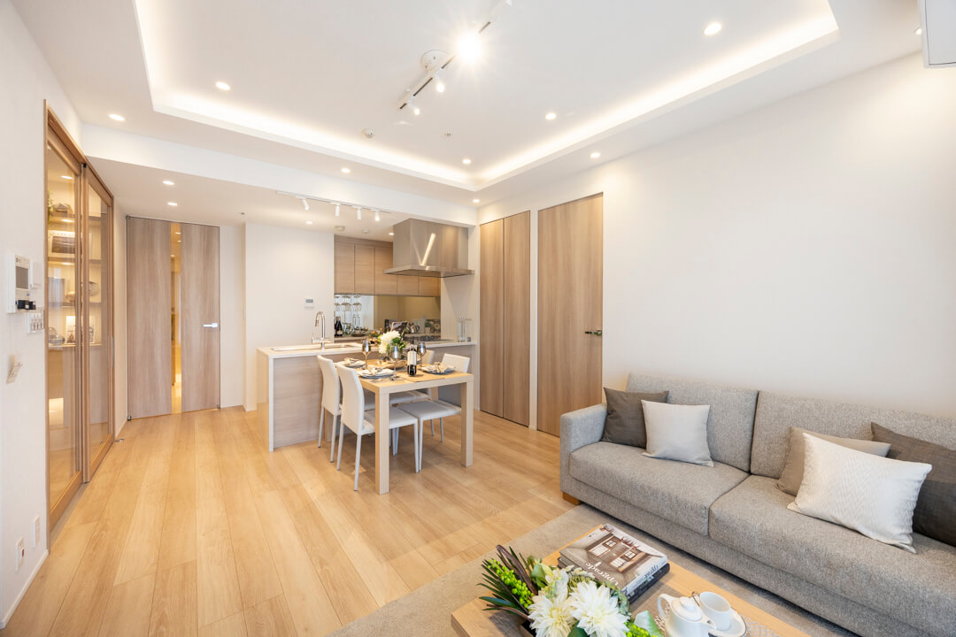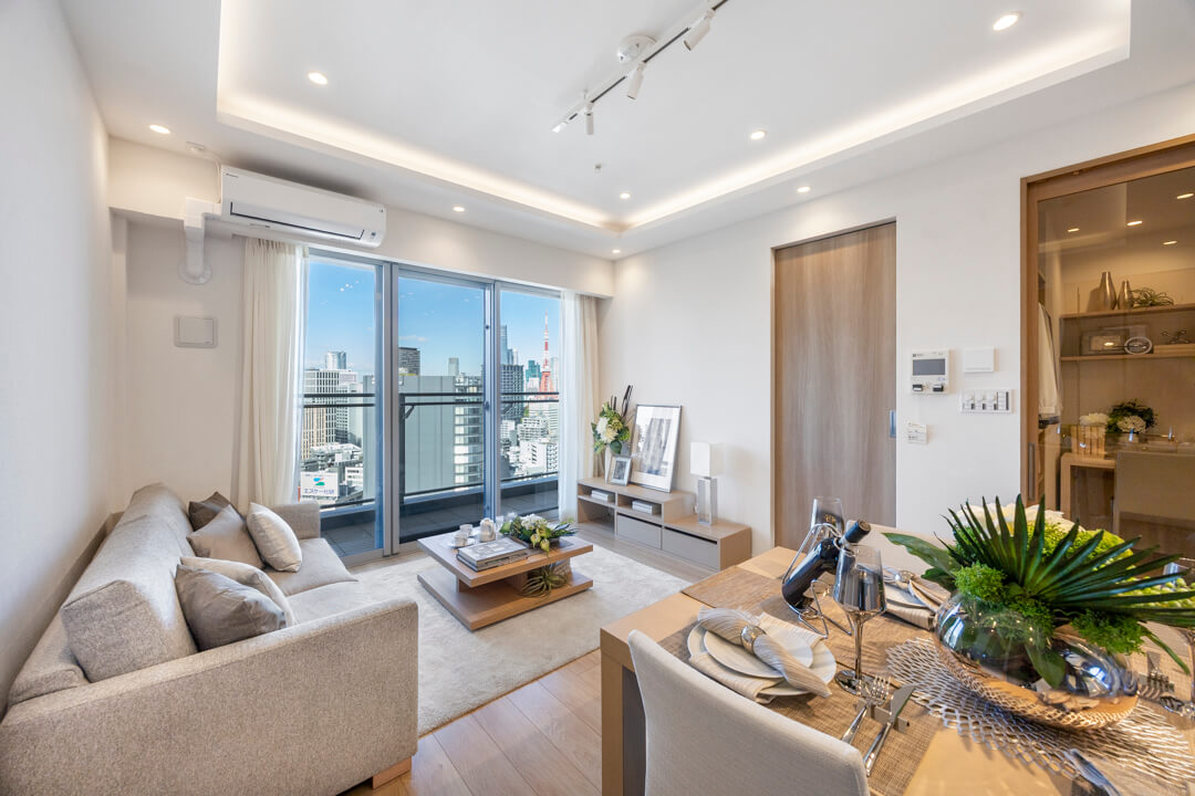 自然光が降り注ぐリビングダイニング。バルコニーに面する窓からは、東京タワーを望むことができます。贅沢な眺めを堪能しながらリラックスタイムを過ごせそうですね。ホワイト系クロスに木目のフローリング&建具を採用したナチュラルな内装はインテリアを選ばず、家具選びの楽しみが広がりそうです。洗練された印象をもたらす間接照明もポイントです。