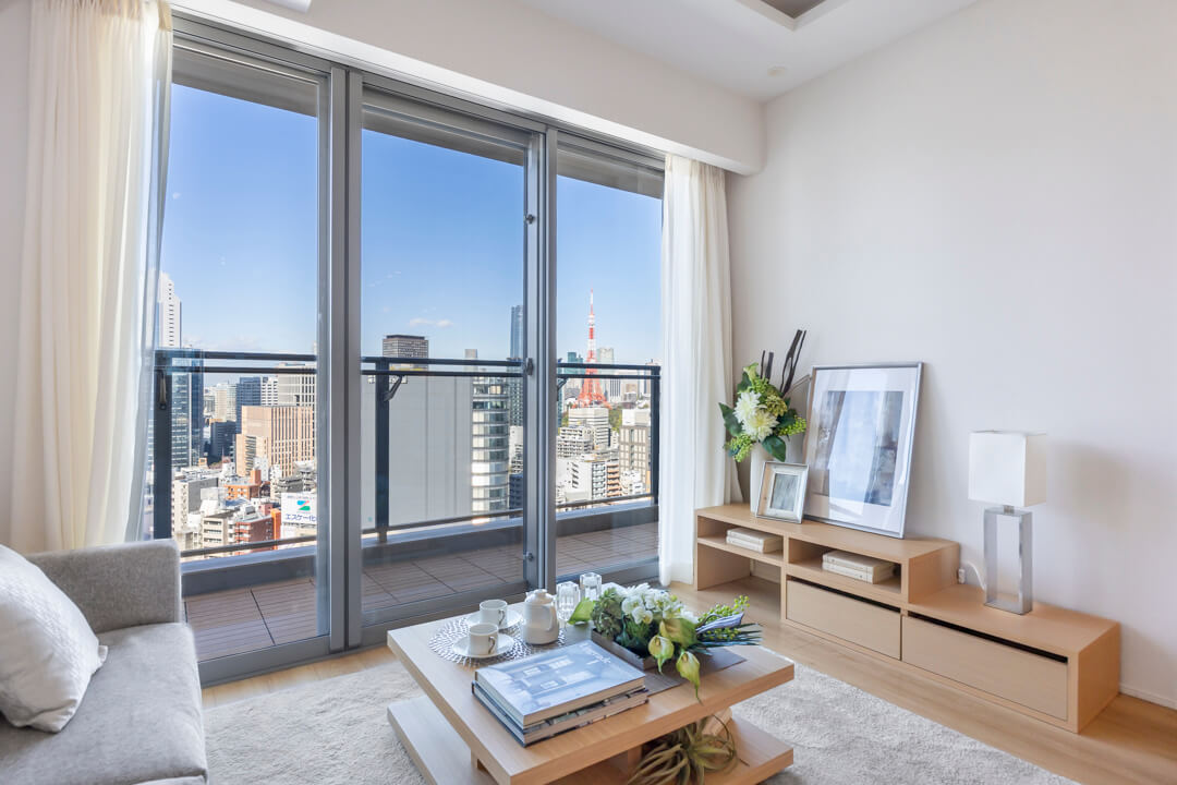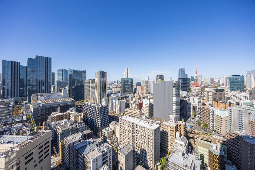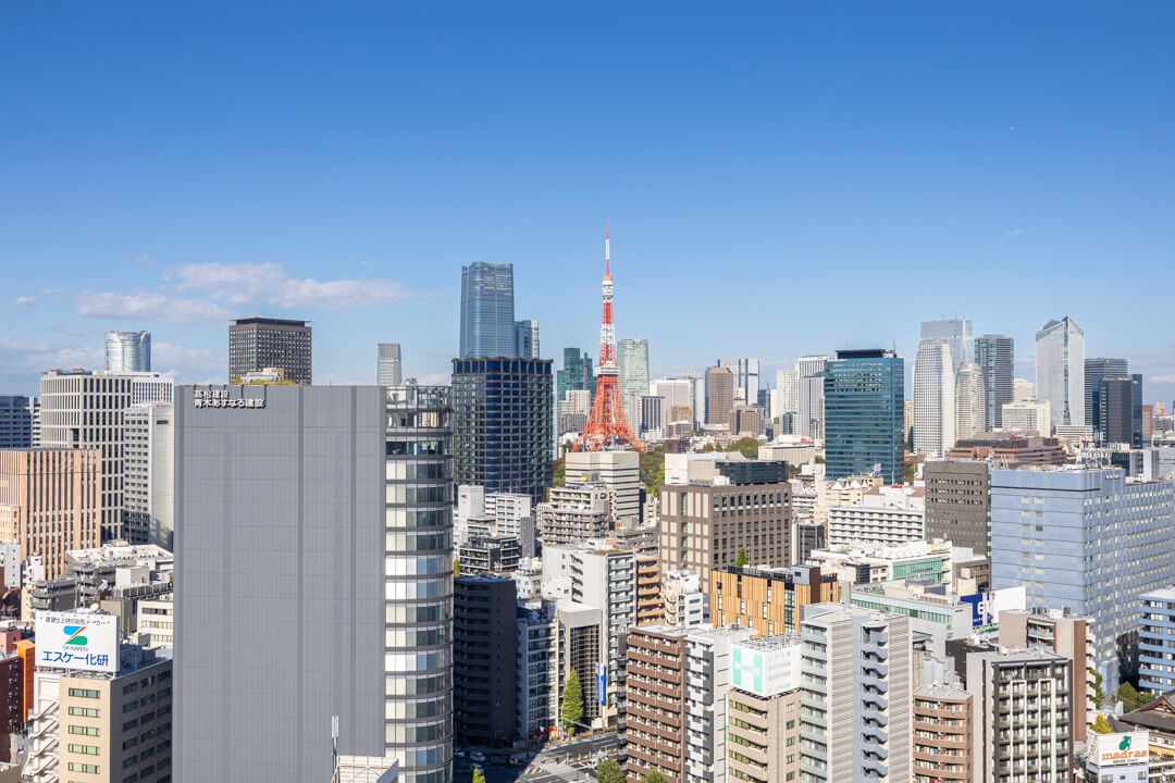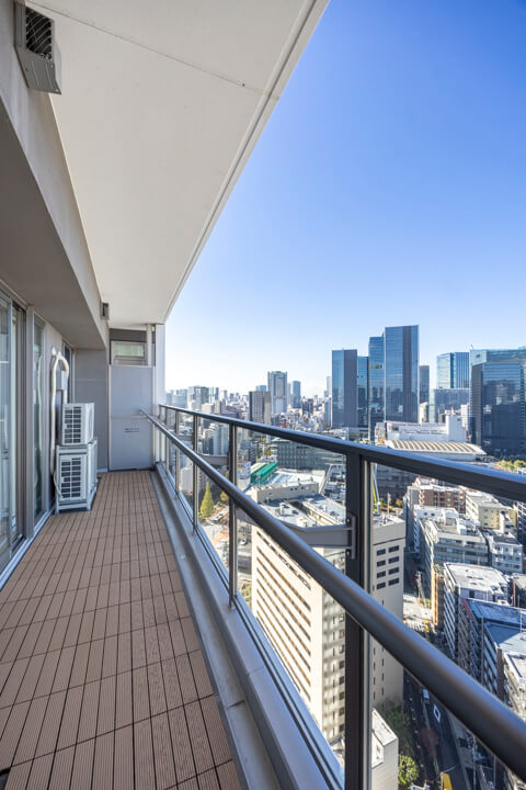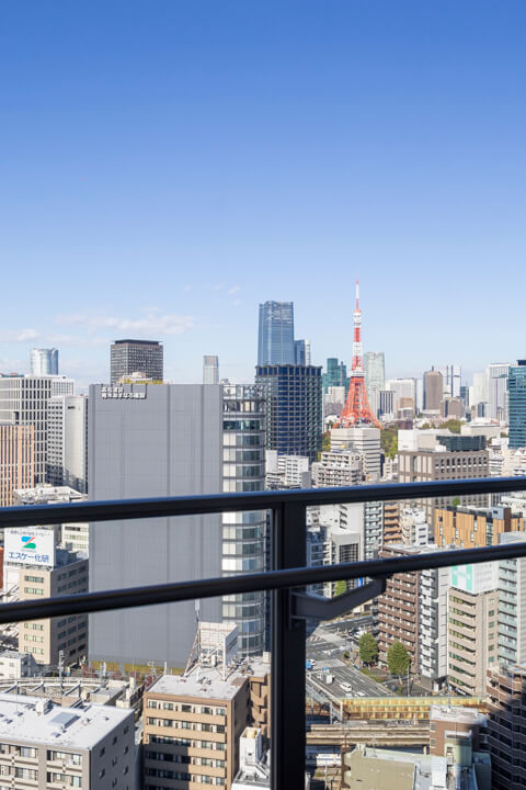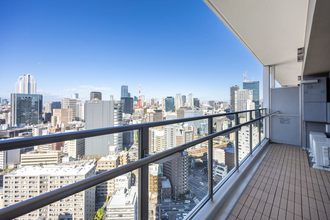 3部屋に跨る広々としたバルコニー。遠く広がる青空に東京タワーが見えて、都会らしい開放的な眺望です。夜のライトアップも楽しみですね。ウッドデッキが敷かれていて、気軽に出入りしやすいのも嬉しいポイントです。
