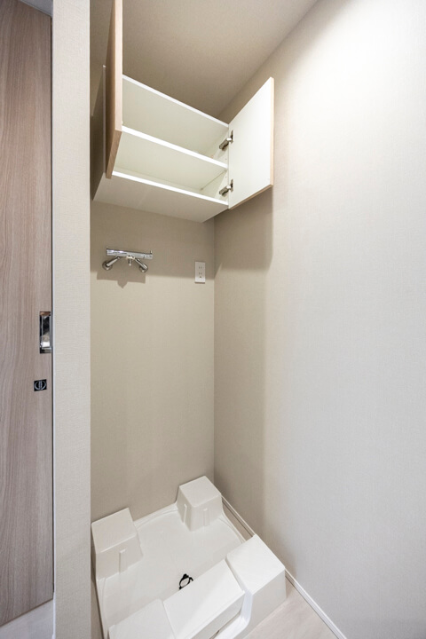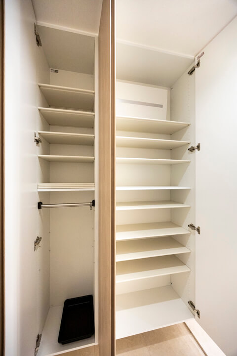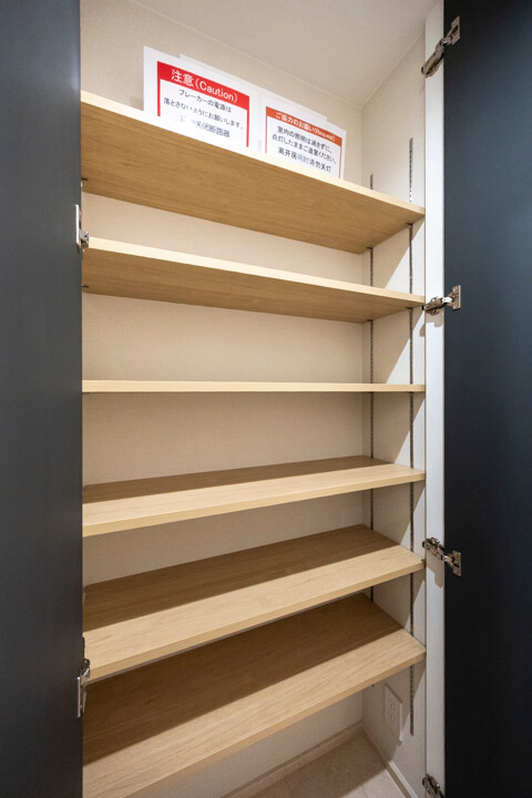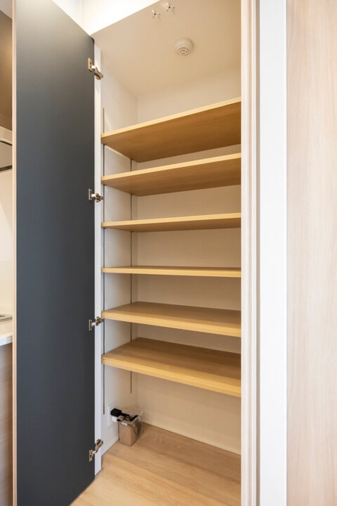 キッチン近くには大容量の可動棚収納を完備しています。生活小物や日用品ストックの収納に重宝しそう。コンセント付きなので、掃除機を充電しながら収納できて便利です。すっきりとしたリビング空間を実現できそうですね。