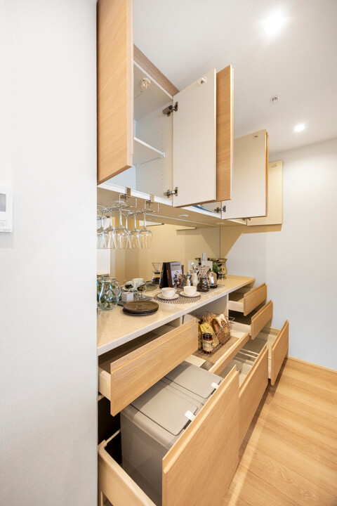 背面には収納力のあるカップボードを完備。キッチンと同じデザインで統一感があります。食料品のストックや食器類を整理整頓でき、ごちゃごちゃしがちなキッチンまわりがすっきり片付きそうですね。ワゴン式のダストボックスで、生活感が出てしまう部分をさりげなくカバーできるのも嬉しいポイントです。
