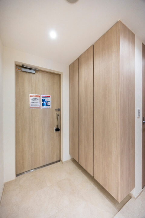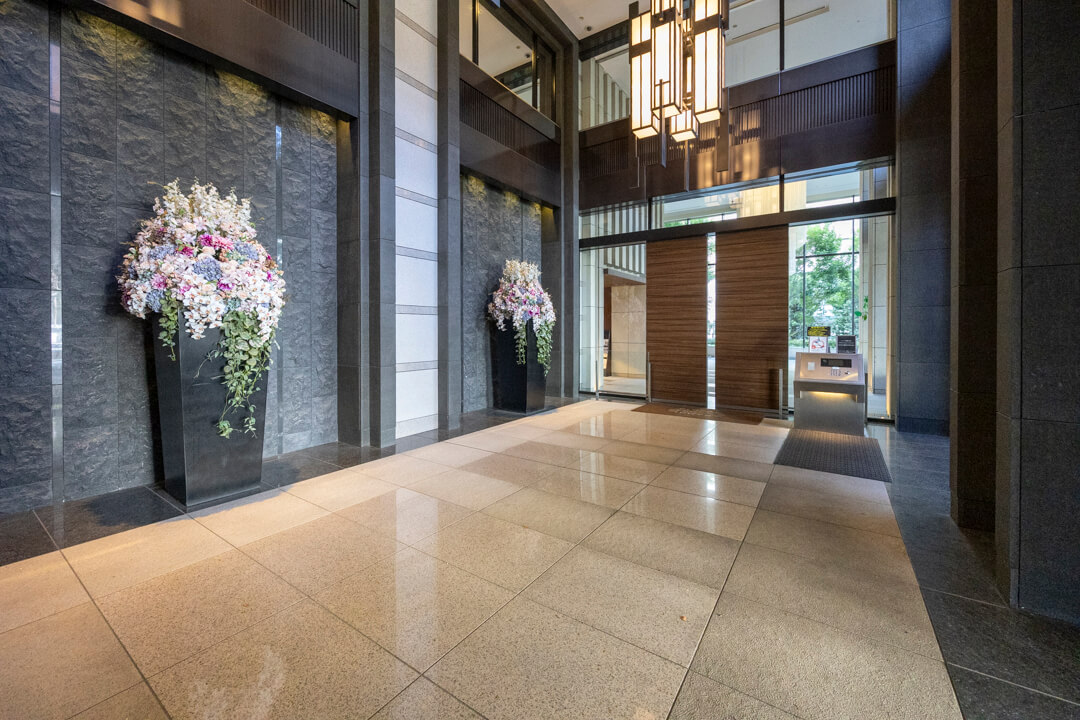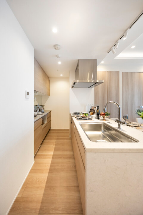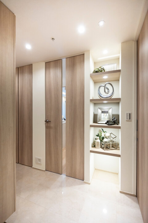 大理石貼りで高級感の漂う玄関・廊下。照明には人感センサーが搭載されていて、いつも明るく出迎えてくれます。荷物で両手が塞がっている時や夜遅く帰宅した時に、スイッチを探す手間がかからず助かりますね。入って正面には照明付きのカウンタースペースがあり、お花や小物を飾ってインテリアを楽しむことができます。シューズボックスはもちろん、廊下収納も付いていて、収納性の高さも魅力的です。