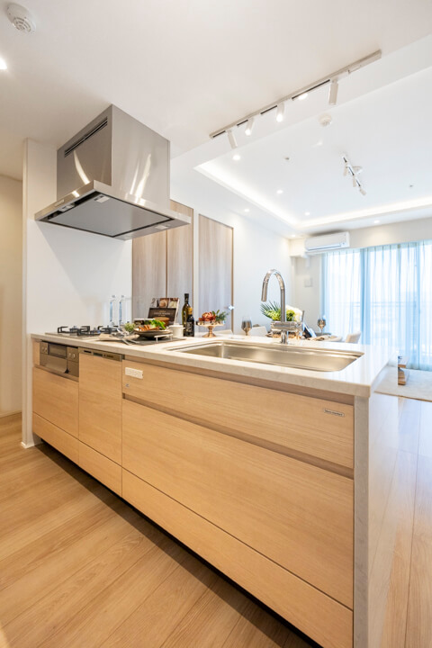 木目デザインが空間に調和するキッチン。リビングダイニングを見渡せる、人気の対面タイプです。開放的な気分で調理ができ、家族のコミュニケーションも増えそうですね。