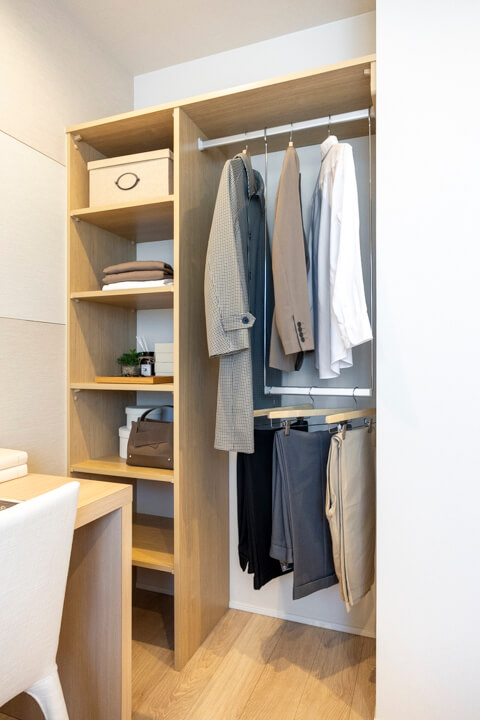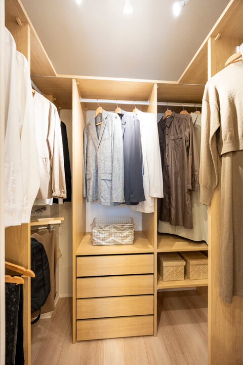 WIC(ウォークインクローゼット)完備で収納力◎。ハンガーパイプとカウンター、引き出しが設置されていて荷物を整理整頓しやすいです。ハンガーパイプが1段に設置されていて、丈の短い洋服を効率良く収納できるのも嬉しいですね。すっきり片付けて居室空間を有効活用できそうです。