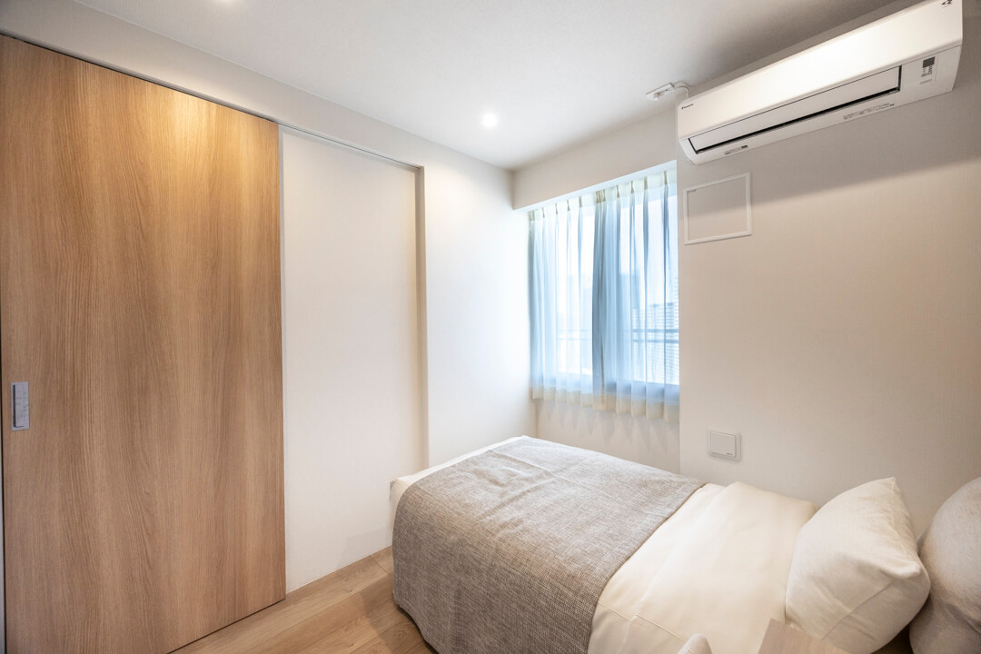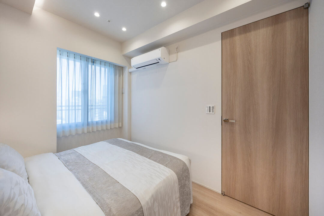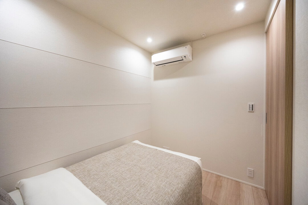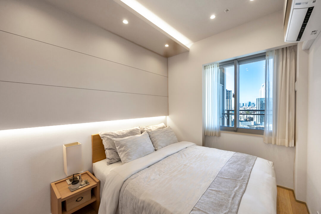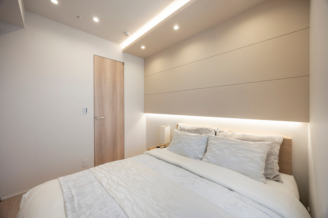 主寝室にぴったりな洋室1。さりげないアクセントウォールから間接照明の心地よい光が漏れて、落ち着く空間を演出します。窓から東京タワーが見えるのも嬉しいポイントです。