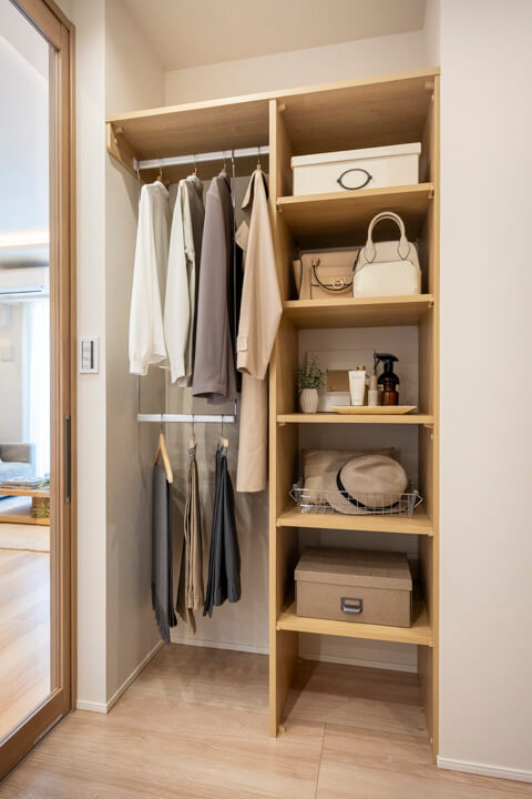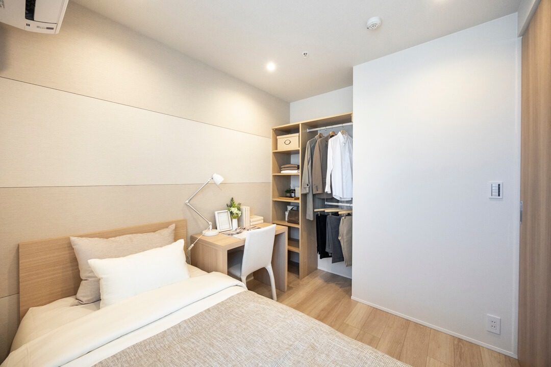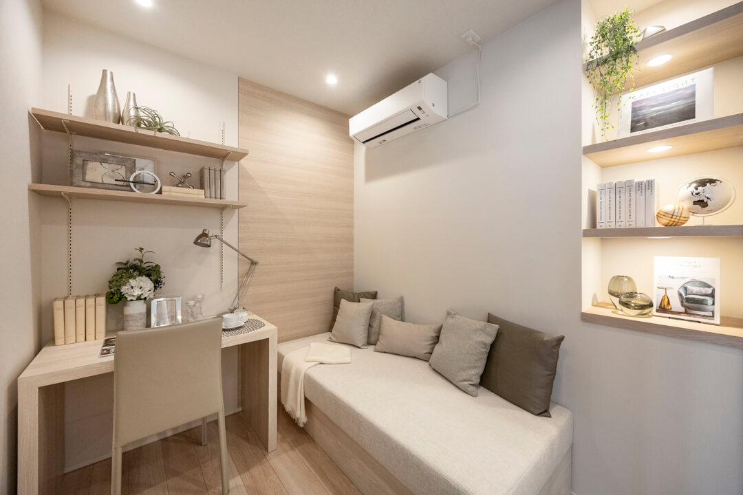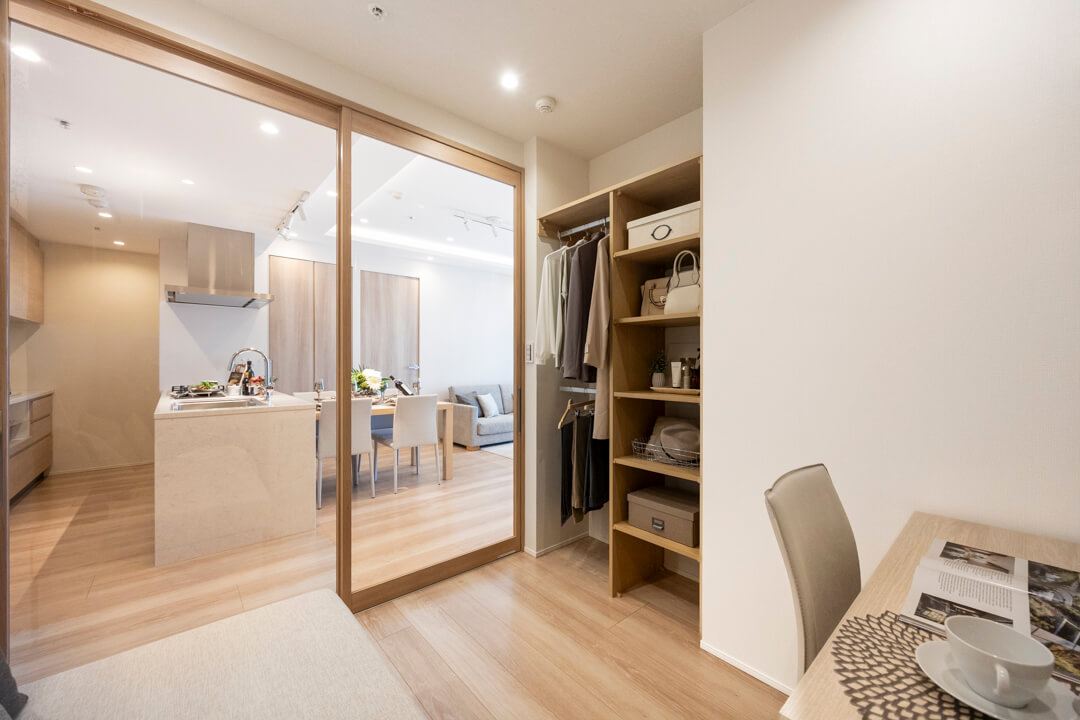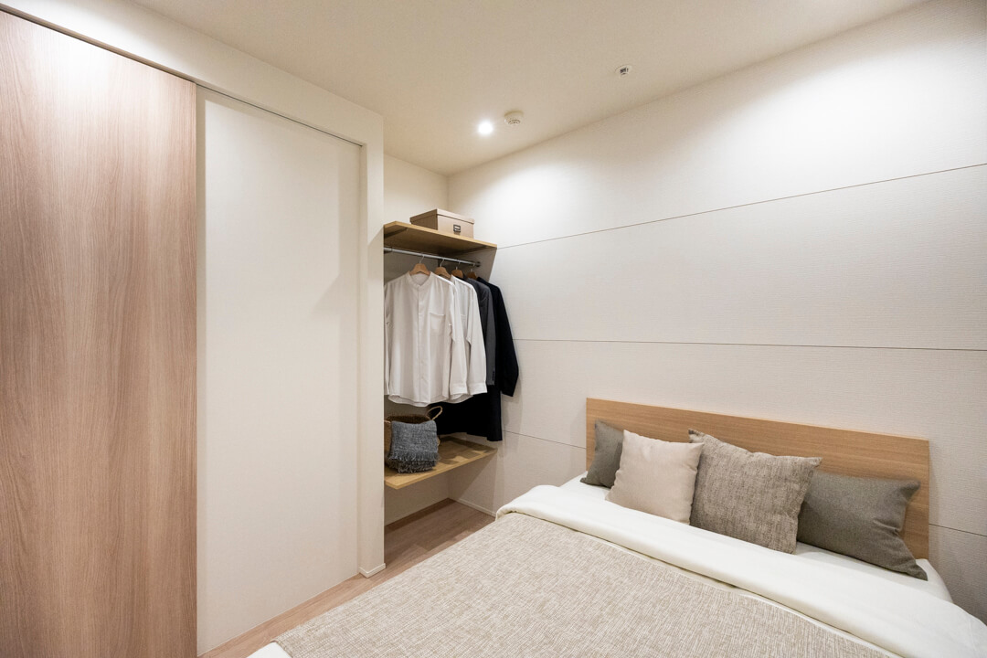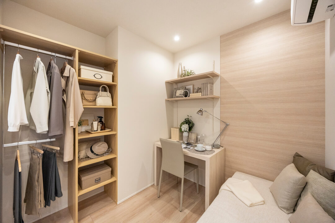 廊下の突き当たりにあるサービスルーム。独立性が高く、落ち着いて過ごせる空間です。寝室としてはもちろん、趣味部屋やゲストルームにしても良いですね。こちらのお部屋にもオープンクローゼットがあり、空間を有効活用できます。