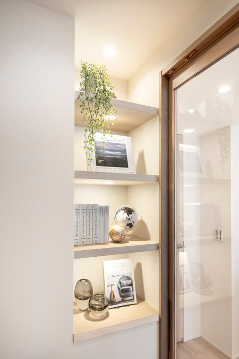 お隣にある洋室3には、ガラスドアを採用しています。ややコンパクトな空間ですが、奥行きがあり圧迫感を感じません。リビングにいる家族との繋がりを感じながら過ごせますね。キッチンから様子が見えるので、お子さまの勉強場所にもぴったり。オープンクローゼット&飾り棚を完備しています。