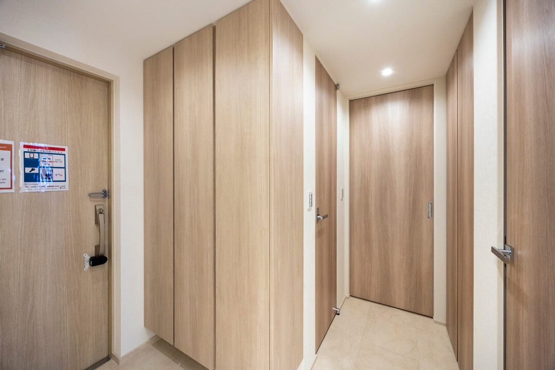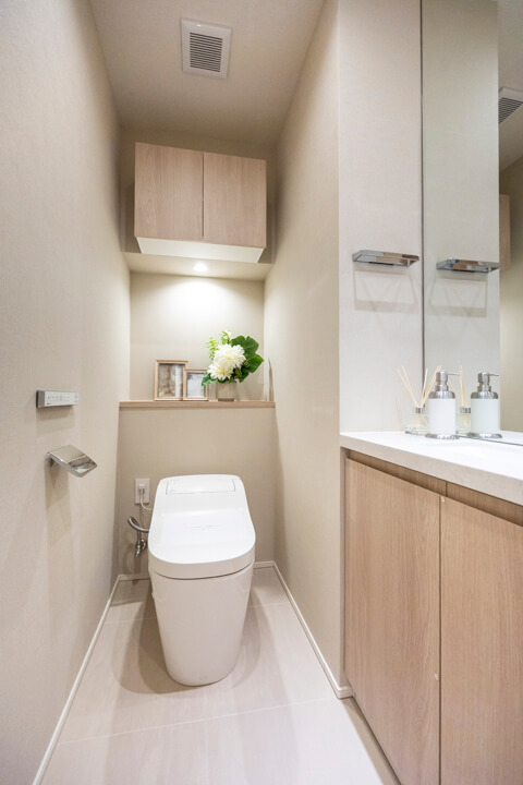 廊下に面していて独立性の高いレストルーム。Panasonic製の温水洗浄機能付トイレに交換済みです。タンクレス仕様でスタイリッシュですね。手洗いカウンター付きなので、すぐに手を洗うことができて衛生的。