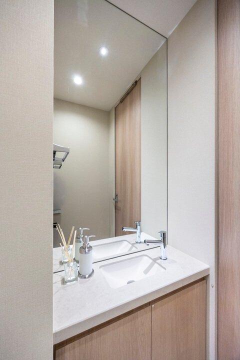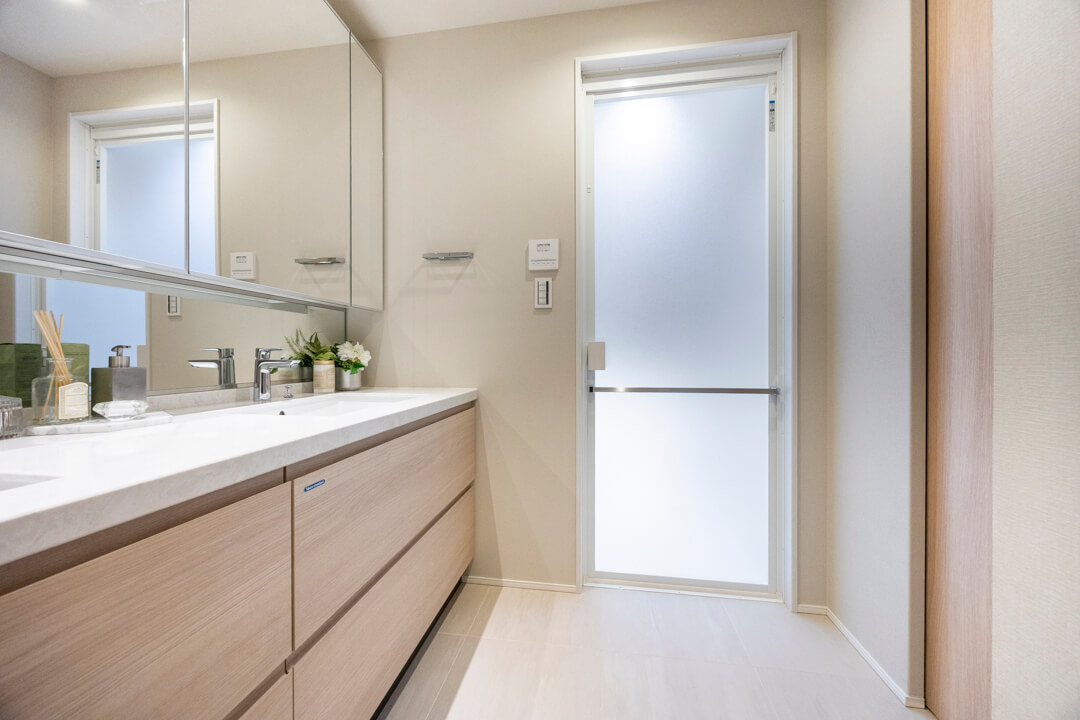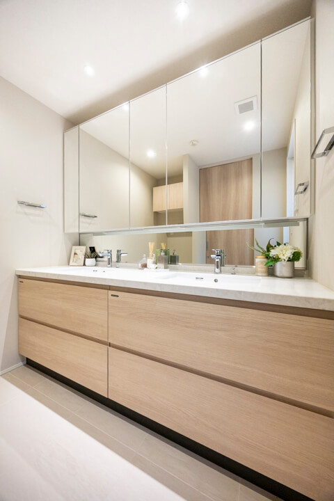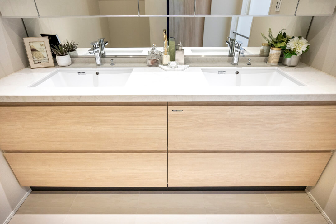2つの洗面ボウルが並ぶ洗面化粧台。2人同時に使用でき、忙しい朝の身支度も安心です。ミラーボックス&引き出し付きで収納スペースもしっかり確保されています。いつも清潔な洗面室をキープできそうですね。